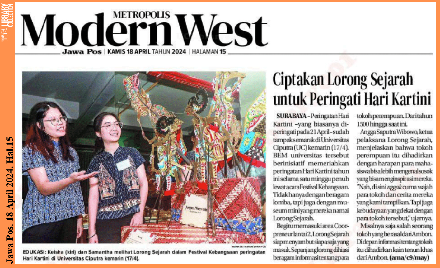 SURABAYA-Peringatan Hari Kartini yang biasanya diperingati pada 21 April sudah tampak semarak di Universitas Ciputra (UC) kemarin (17/4). BEM universitas tersebut berinisiatif memeriahkan peringatan Hari Kartini tahun ini selama satu minggu penuh lewat acara Festival Kebangsaan. Tidak hanya dengan beragam lomba, tapi juga dengan museum mini yang mereka namai Lorong Sejarah.