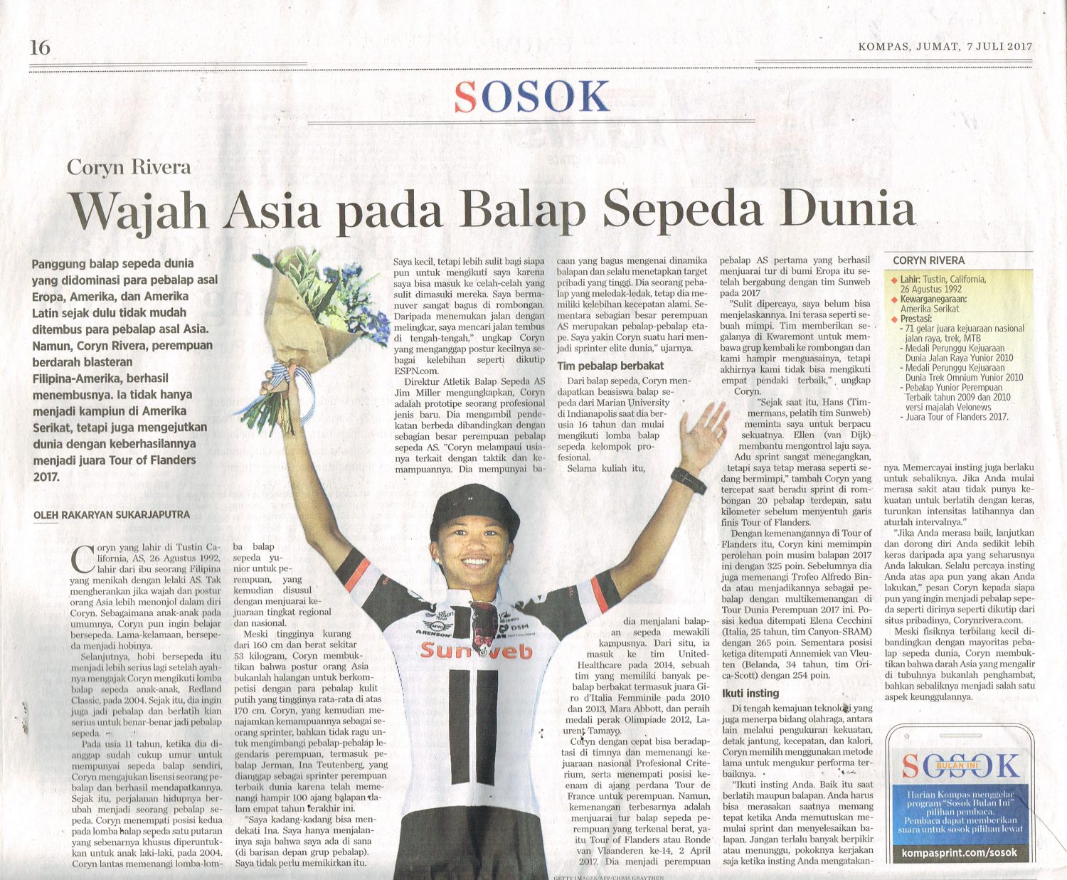 Panggung balap sepeda dunia yang didominasi para pebalap asal Eropa, Amerika, dan Amerika Latin sejak dulu tidak mudah ditembus para pebalap asal Asia. Namun, Coryn Rivera, perempuan berdarah blasteran Filipina-Amerika, berhasil menembusnya. la tidak hanya menjadi kampiun di Amerika Serikat, tetapi juga mengejutkan dunia dengan menjadi juara Tur di Flanders 2017.