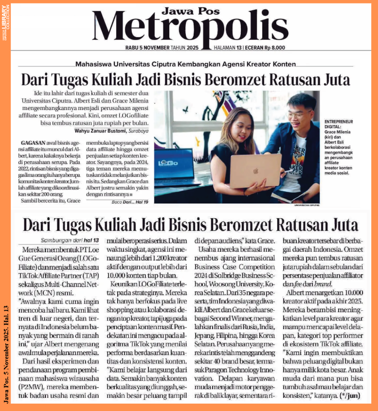 Keunikan LOGoFiliate terletak pada strateginya. Mereka tak hanya berfokus pada live shopping atau kolaborasi dengan top kreator, tapi juga pada penciptaan konten masif. Pendekatan ini mengacu pada algoritma Tik Tok yang menilai performa berdasarkan kuantitas dan konsistensi konten, “Kami belajar langsung dari data. Semakin banyak konten berkualitas yang diunggah, semakin besar peluang tampil didepan audiens” kata Grace.
