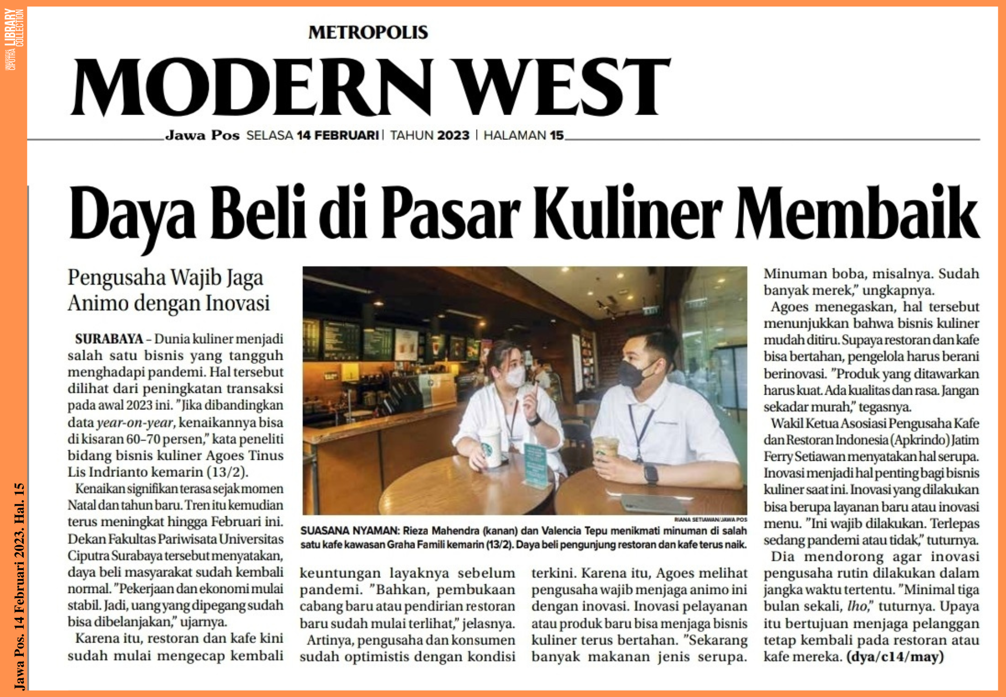 Kenaikan signifikan terasa sejak momen Natal dan tahun baru. Tren itu kemudian terus meningkat hingga Februari ini. Dekan Fakultas Pariwisata Universitas Ciputra Surabaya tersebut menyatakan, daya beli masyarakat sudah kembali normal. “Pekerjaan dan ekonomi mulai stabil. Jadi, uang yang dipegang sudah bisa dibelanjakan,” ujarnya.