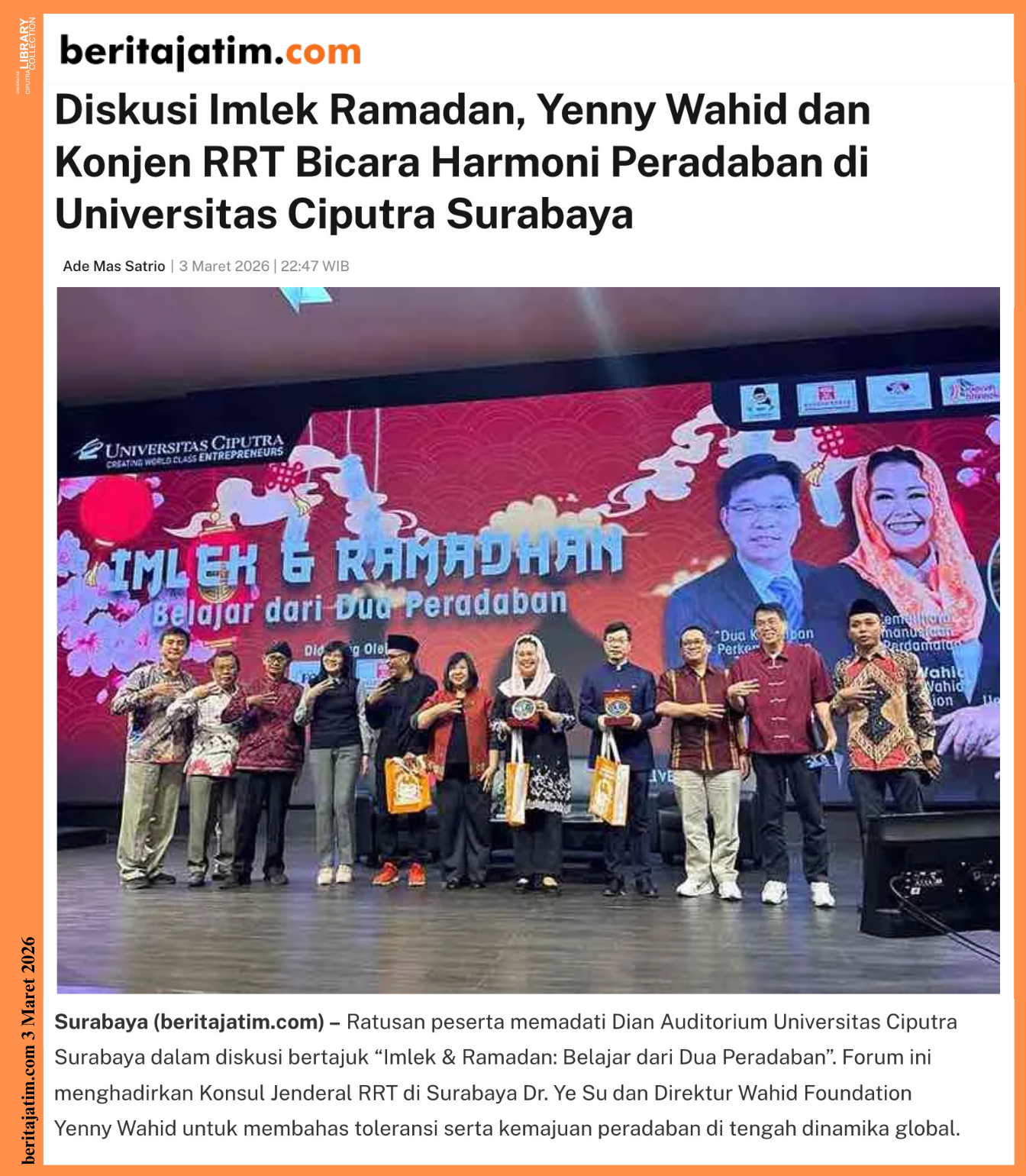 Sumber : https://beritajatim.com/diskusi-imlek-ramadan-yenny-wahid-dan-konjen-rrt-bicara-harmoni-peradaban-di-universitas-ciputra-surabaya