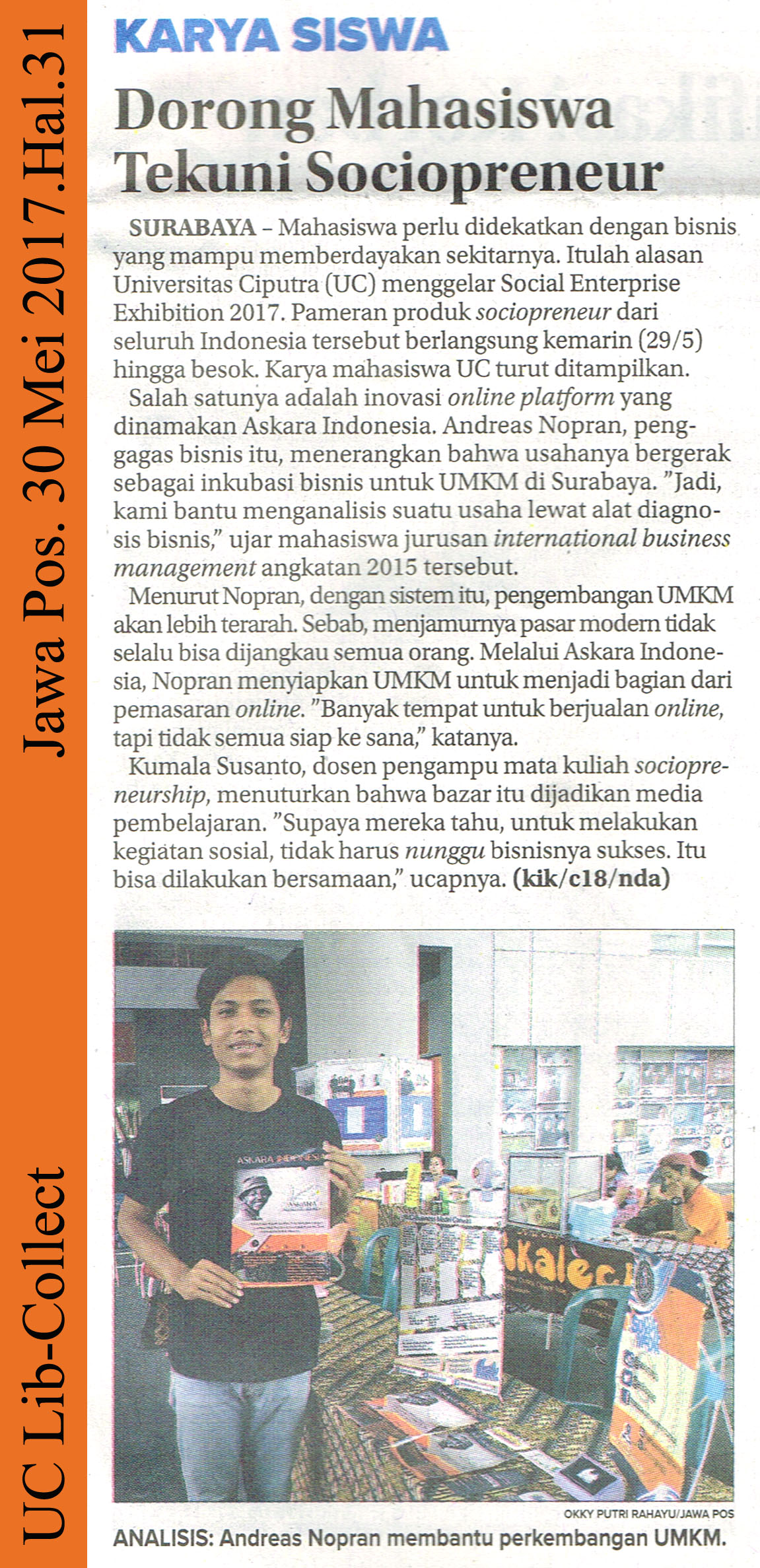 Salah satunya adalah inovasi online platform yang dinamakan Askara Indonesia. Andreas Nopran, penggagas bisnis itu, menerangkan bahwa usahanya bergerak sebagai inkubasi bisnis untuk UMKM Surabaya. “Jadi, kami bantu menganalisis seluruh usaha lewat alat diagnosis bisnis,” ujar mahasiswa jurusan international business management angkatan 2015 tersebut.