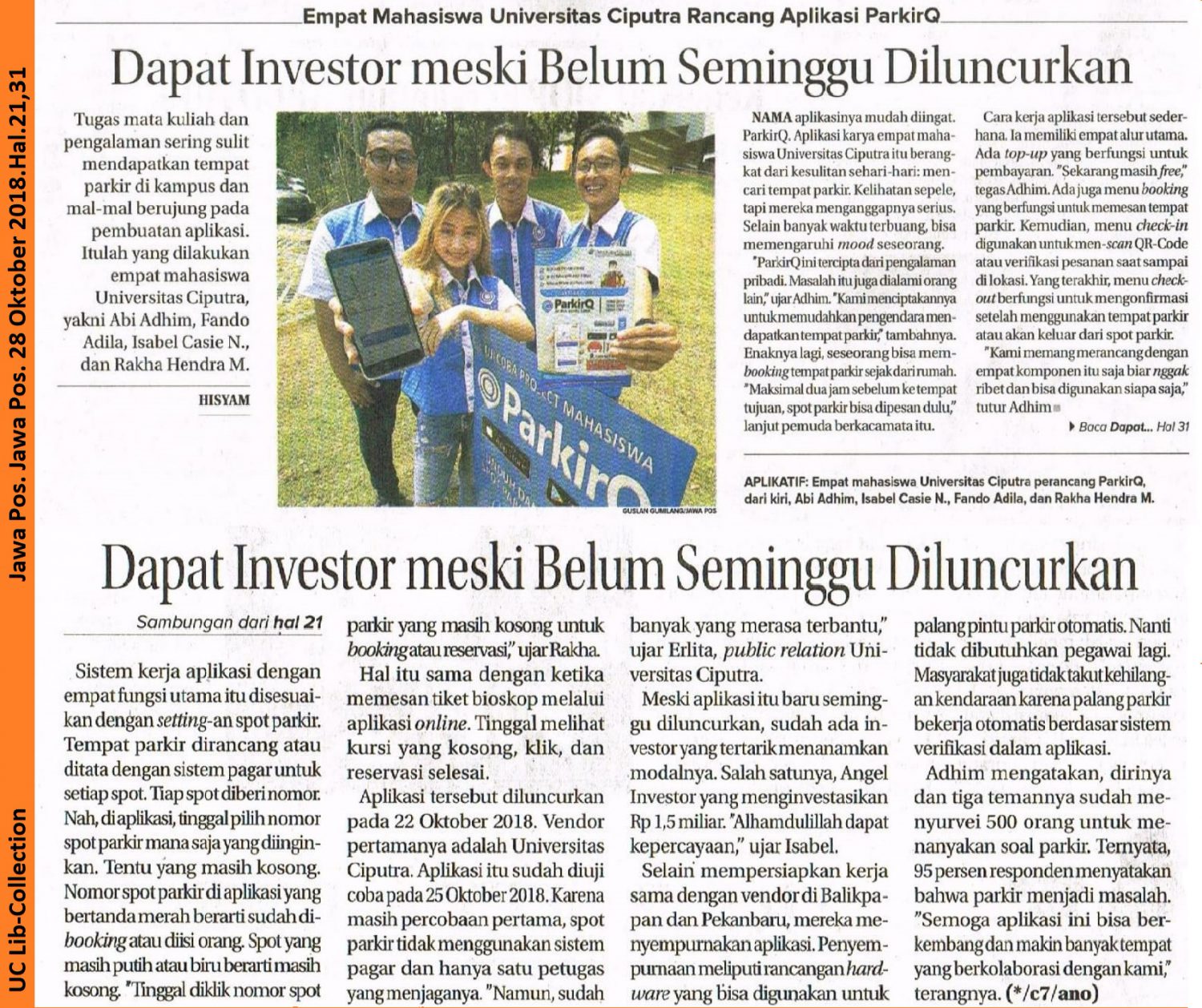 Aplikasi tersebut diluncurkan pada 22 Oktober 2018. Vendor pertamanya adalah Universitas Ciputra. Aplikasi itu sudah diuji coba pada 25 Oktober 2018. Karena masih percobaan pertama, spot parkir tidak menggunakan sistem pagar dan hanya satu petugas yang menjaganya. “Namun, sudah banyak yang merasa terbantu,” ujar Erlita, public relation Universitas Ciputra.