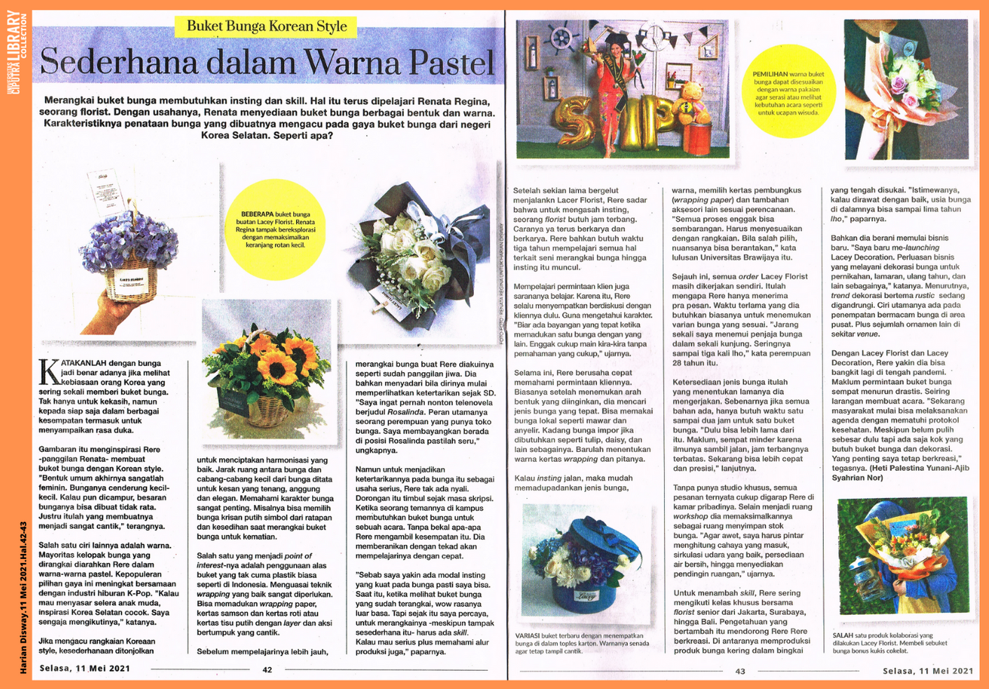 Merangkai buket bunga membutuhkan insting dan skill. Hal itu terus dipelajari Renata Regina, seorang florist. Dengan usahanya, Renata menyediaan buket bunga berbagai bentuk dan warna. Karakteristiknya penataan bunga yang dibuatnya mengacu pada gaya buket bunga dari negeri Korea Selatan. Seperti apa?