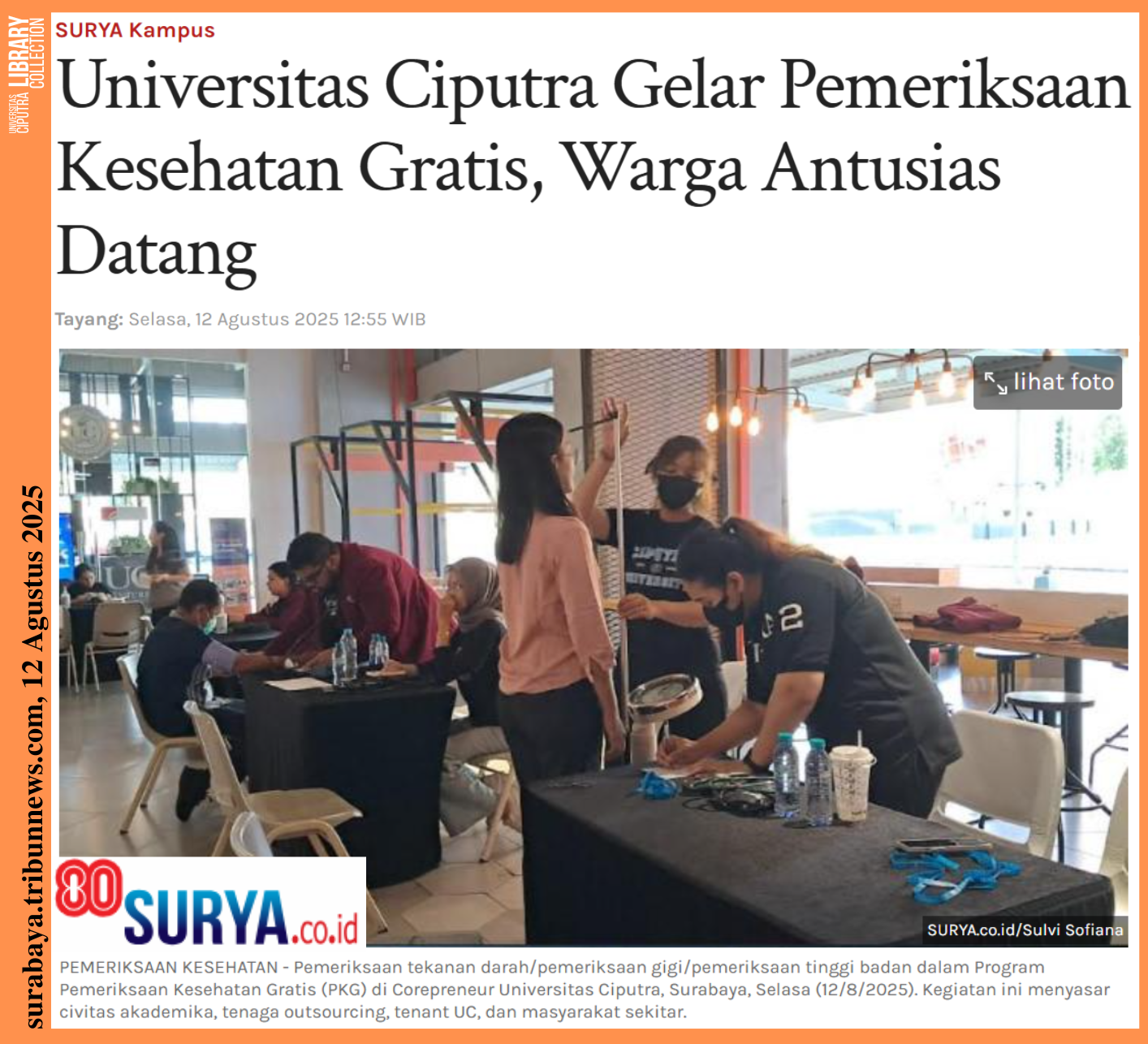 SURYA.CO.ID, SURABAYA – Ciputra University (UC) Surabaya, East Java, held a Free Health Check-up Program (PKG) at the UC Corepreneur Building on Tuesday (August 12, 2025).