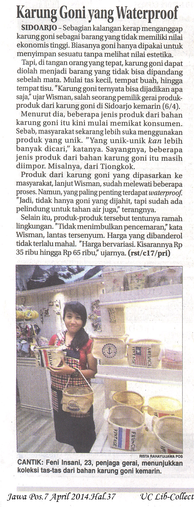 Tapi, di tangan orang yang tepat, karung goni dapat diolah menjadi barang yang tidak bisa dipandang sebelah mata. Mulai tas kecil, tempat buah, hingga tempat wisu. “Karung goni ternyata bisa dijadikan apa saja,”ujar Wisman, salah seorang pemilik gerai produk-produk dari karung goni di Sidoarjo kemaren(6/4).