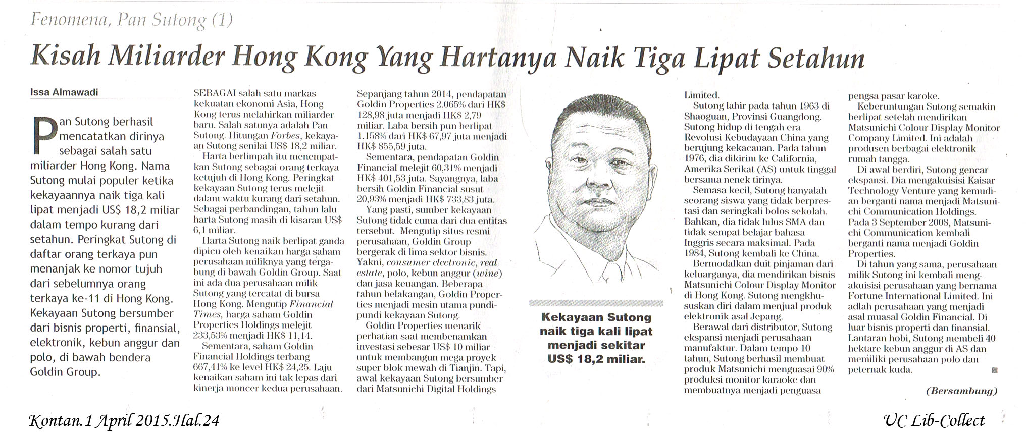 SEBAGAI salah satu markas kekuatan ekonomi Asia, Hong Kong terus melahirkan miliarder baru. Salah satunya adalah Pan Sutong. Hitungan Forbes, kekayaan Sutong senilai US$ 18,2 miliar.