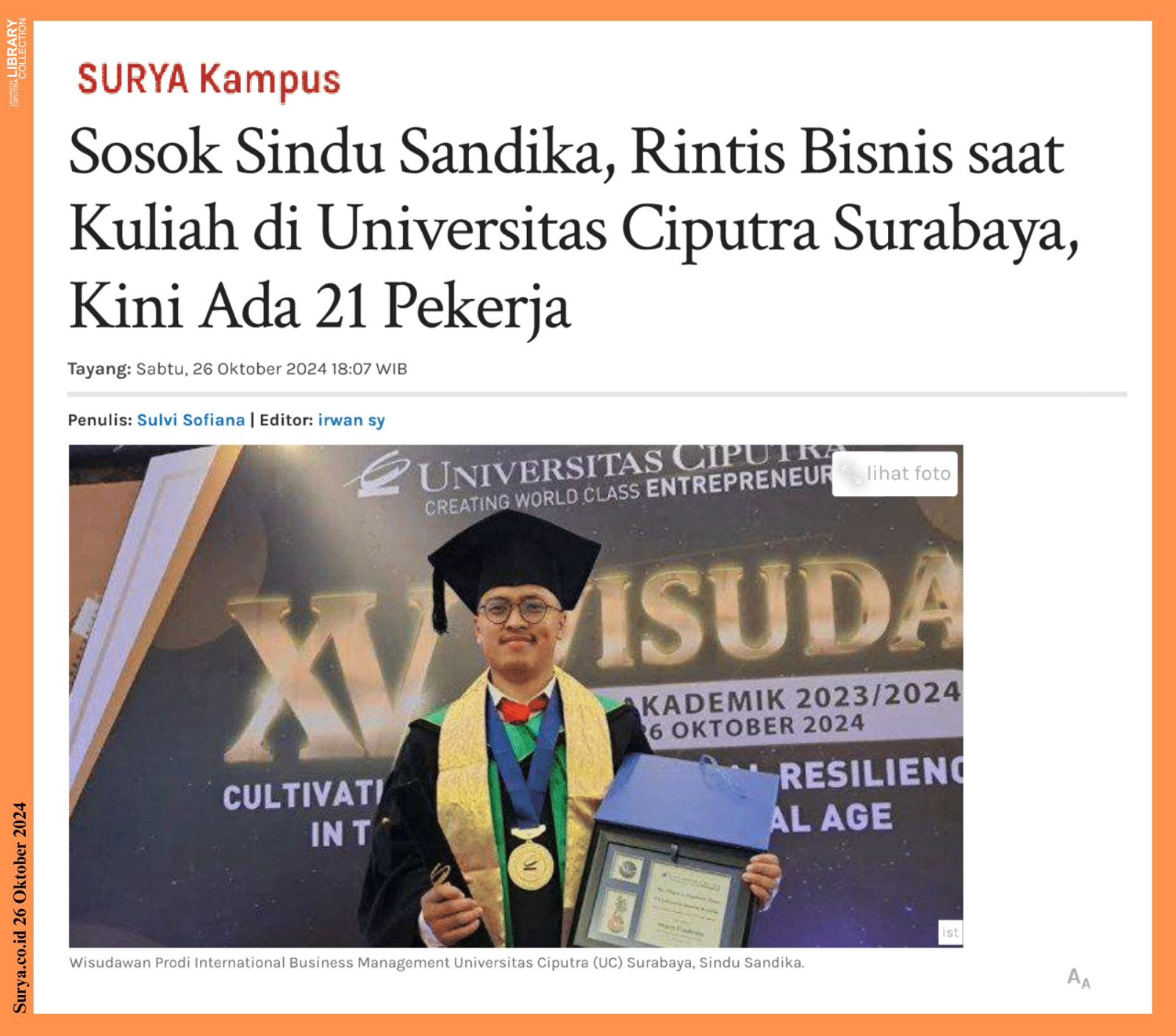 SURYA.co.id | SURABAYA – Wisudawan Prodi International Business Management Universitas Ciputra (UC) Surabaya, Sindu Sandika, berhasil menjalankan proyek bisnis yang ia rintis dari tugas kuliah di semester dua menjadi bisnis yang menjadi lapangan pekerjaan bagi warga di sekitar tempat tinggalnya.