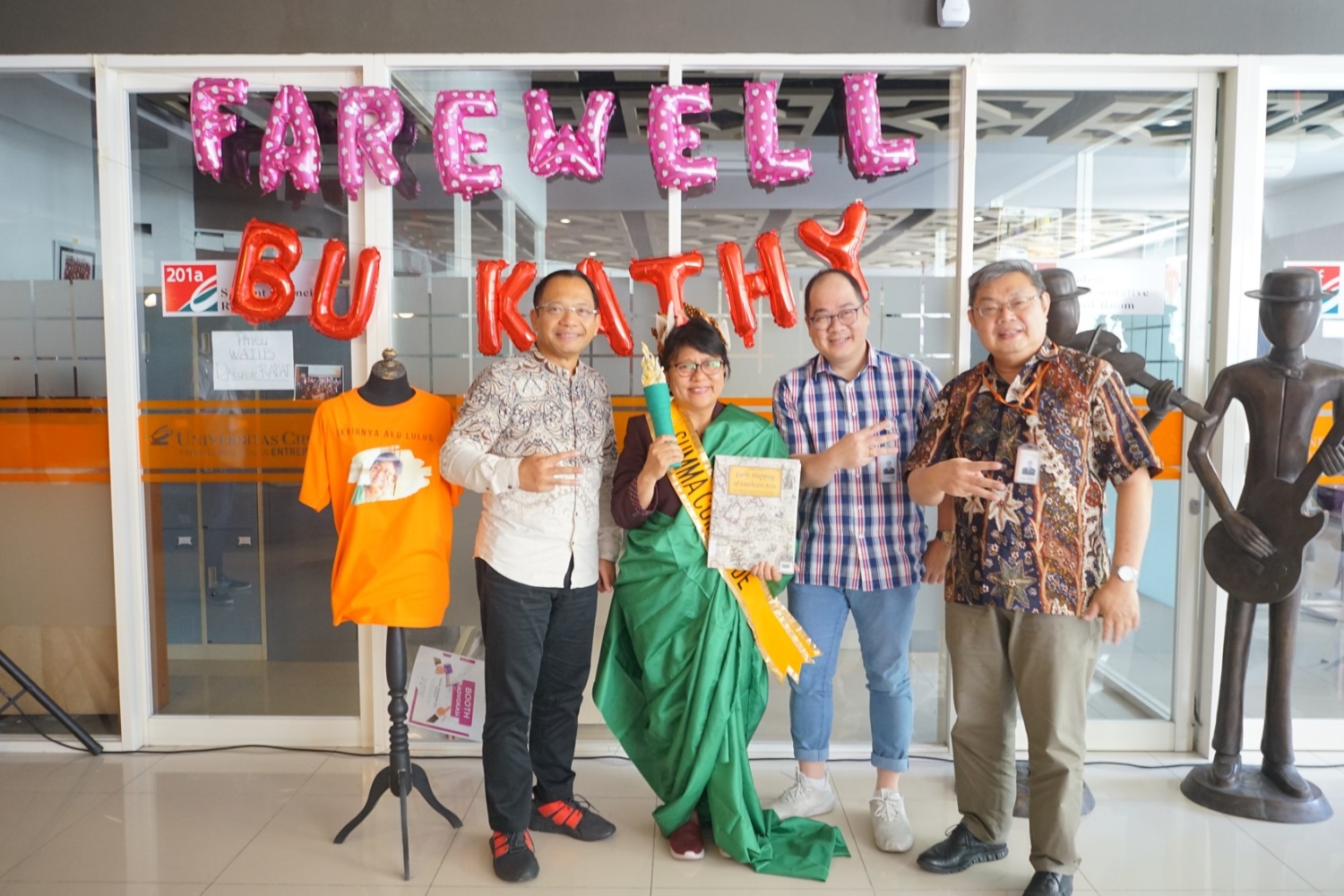 Pada Jumat lalu (28/2) diadakan acara perpisahan kepala Perpustakaan Universitas Ciputra Surabaya Ibu Ibu Suzanna Katharina Mamahit, S.Sos., M.IP. yang memasuki masa purna bakti per 28 Februari lalu. Pada acara yang dimulai sekitar pkl. 11.30 wib ini dihadiri oleh jajaran Yayasan dan Rektorat, serta para dosen dan staff Universitas Ciputra. Pada kesempatan ini pula Bu Kathy mendapatkan “baju kehormatan” berupa busana ala patung Liberty dan selempang bertuliskan ‘summa cum laude’. Busana ini menggambarkan sosok Bu Kathy yang telah mencapai  kemenangan dan tetap membawa obor dan buku yang menjadi simbol terang, ilmu pengetahuan, dan berkat di manapun berada.