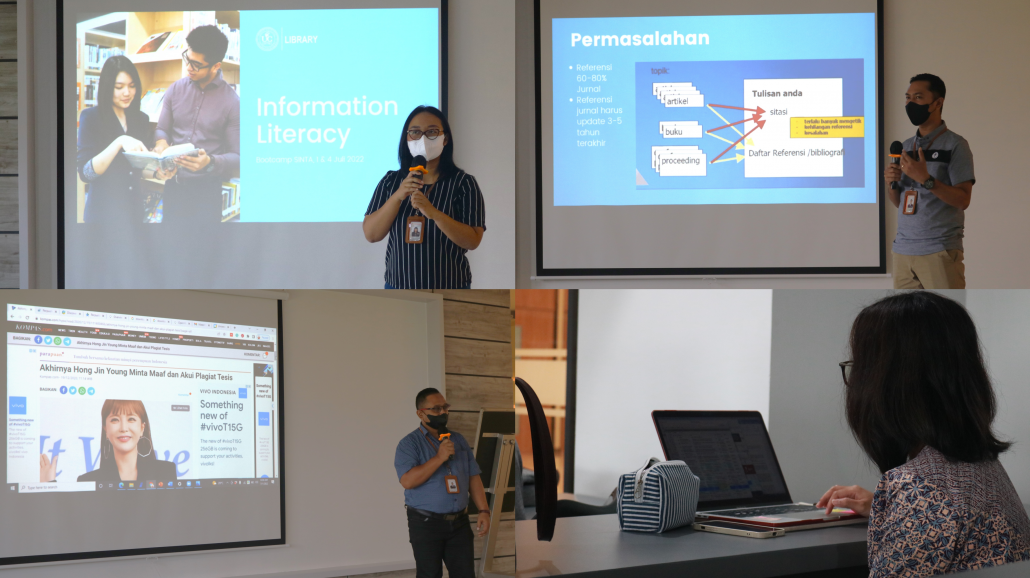 Pada Jumat, 1 Juli lalu, tim UC Library menjadi salah satu fasilitator pada Bootcamp SINTA yang diadakan oleh departemen HCM (Human Capital Management) dan LPPM (Lembaga Penelitian dan Pengabdian Masyarakat) UC. Fasilitator dari Library diwakili oleh Pak R. Panji Yohanes Udik Esbiantoro, S.S dan Pak Yehuda Abiel, S.Sos. yang memberikan penjelasan dalam penelusuran informasi dan penulisan artikel ilmiah dan dilaksanakan di ruang 1540 Mini Theatre UC Tower dari Pkl. 08.00-16.30 WIB.