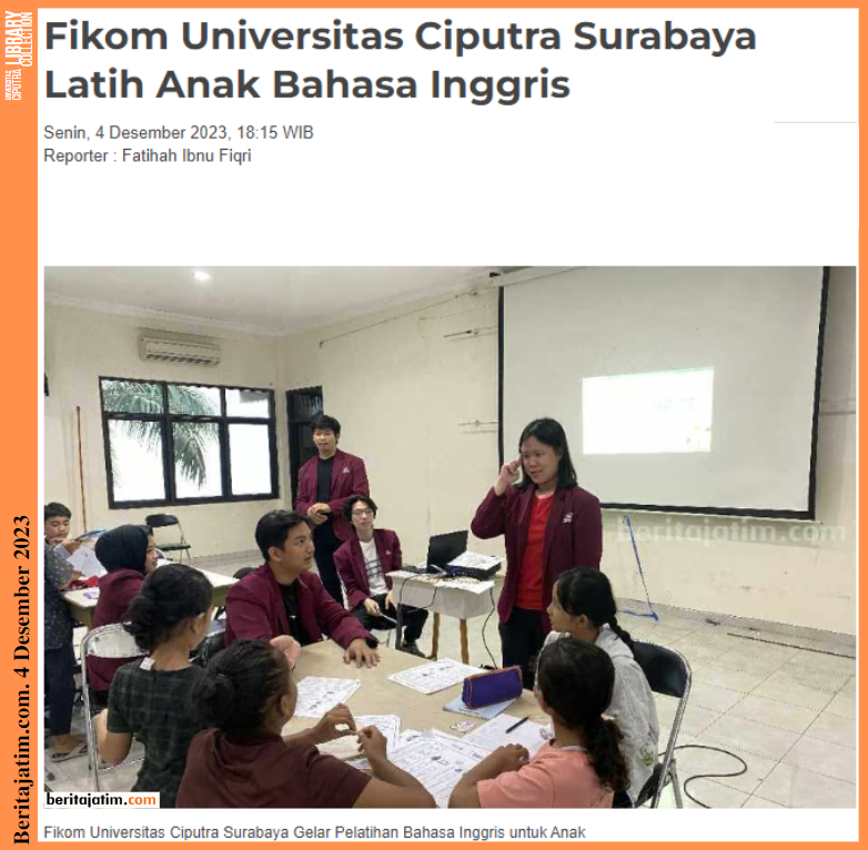 sumber : https://beritajatim.com/pendidikan-kesehatan/fikom-universitas-ciputra-surabaya-latih-anak-bahasa-inggris/