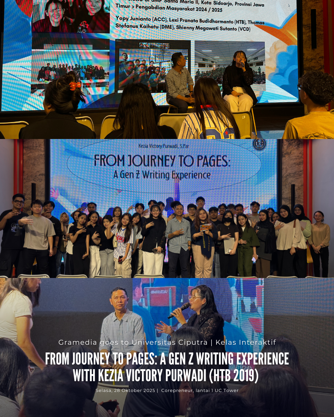Hari kedua Gramedia Goes to Campus pada 28 Oktober 2025 di UC penuh energi — kelas interaktif 1 bertajuk “From Journey to Pages: A Gen Z Writing Experience” bersama Kezia Victory Purwadi, alumni Hotel and Tourism Business (HTB) 2019 yang menulis dan berhasil menerbitkan 1 buku berbagi pengalaman literasinya dengan moderator Pak Yehuda Abiel, S.Sos.M.A (Head, Library). Dalam sesi ini, bertempat di Corepreneur UC Tower lantai 1, Kezia menceritakan perjalanan pribadinya dari seorang mahasiswa yang melakukan pengabdian masyarakat akhirnya menuangkan pengalamannya dalam bentuk sebuah karya yang bermakna dan berdampak. Ia membagikan pengalamannya membagi waktu, menyusun timeline dalam menulis dan sarana menyuarakan pengalaman generasi muda, khususnya Gen Z, yang tumbuh di tengah arus digitalisasi dan perubahan sosial yang cepat.