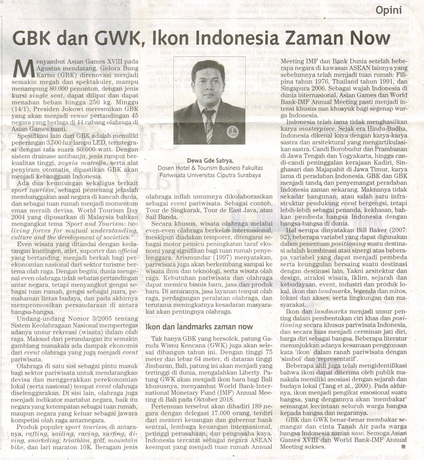 Oleh Dewa Gde Satrya (Dosen Hotel & Tourism Business Fakultas Pariwisata Universitas Ciputra Surabaya)