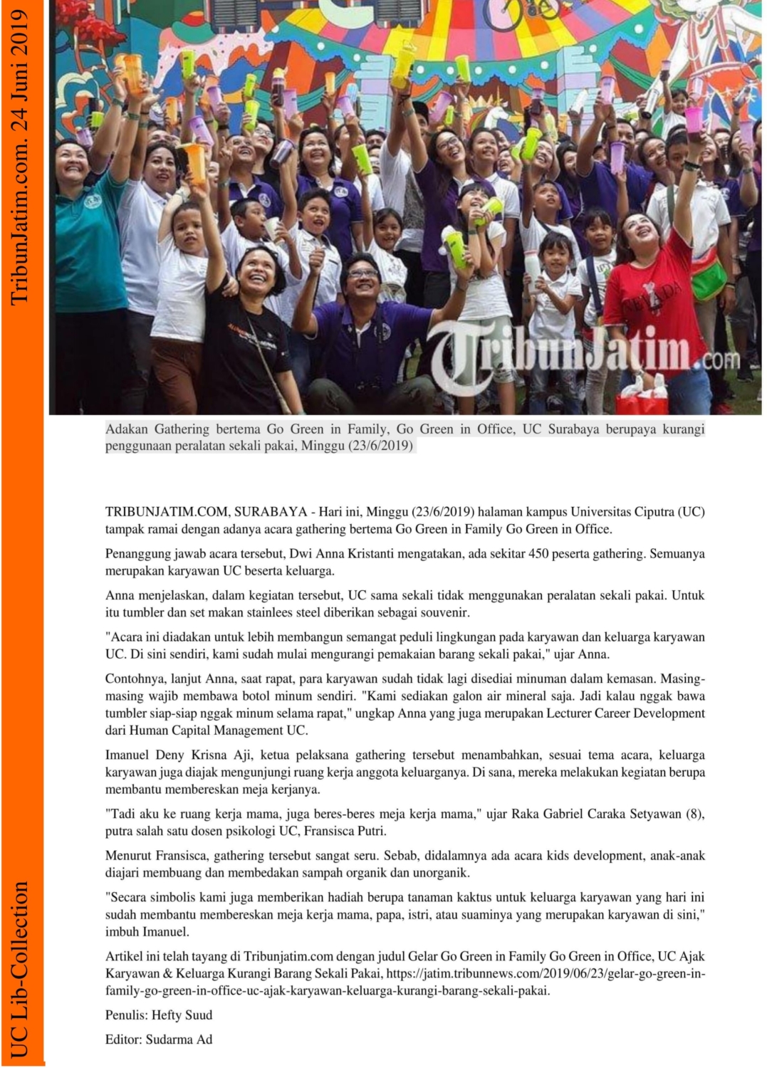TRIBUNJATIM.COM, SURABAYA – Hari ini, Minggu (23/6/2019) halaman kampus Universitas Ciputra (UC) tampak ramai dengan adanya acara gathering bertema Go Green in Family Go Green in Office.