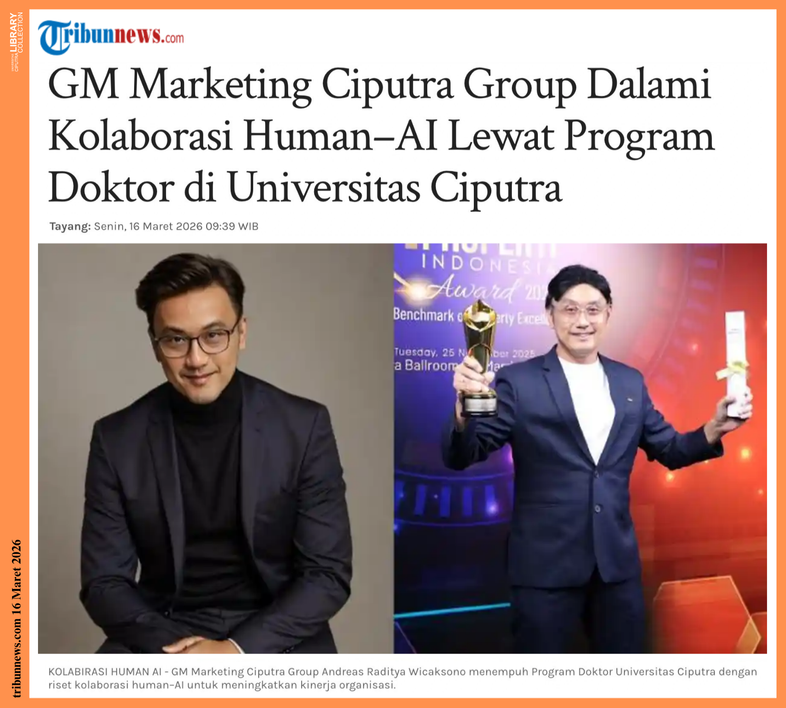 General Manager Marketing di Ciputra Group itu kini menempuh Program Doktor Manajemen & Entrepreneurship di Universitas Ciputra Surabaya dengan fokus riset kolaborasi antara manusia dan kecerdasan buatan (human–AI collaboration) untuk meningkatkan kinerja organisasi.