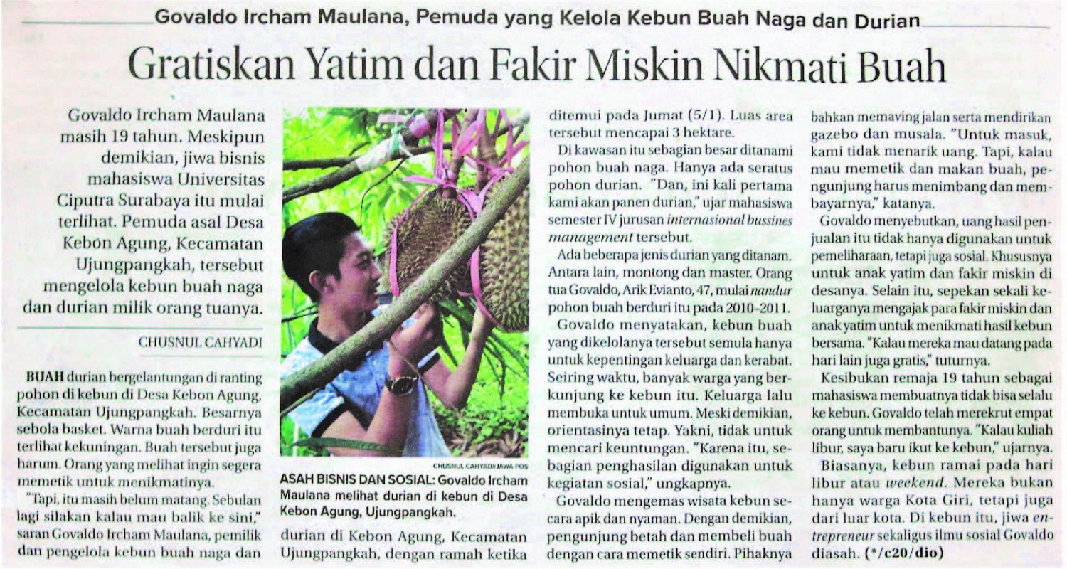 Govaldo Ircham Maulana masih 19 tahun. Meskipun demikian, jiwa bisnis mahasiswa Universitas Ciputra Surabaya itu mulai terlihat. Pemuda asal Desa Kebon Agung, Kecamatan Ujungpangkah, tersebut mengelola kebun buah naga dan durian milik orang tuanya. – CHUSNUL CAHYADI
