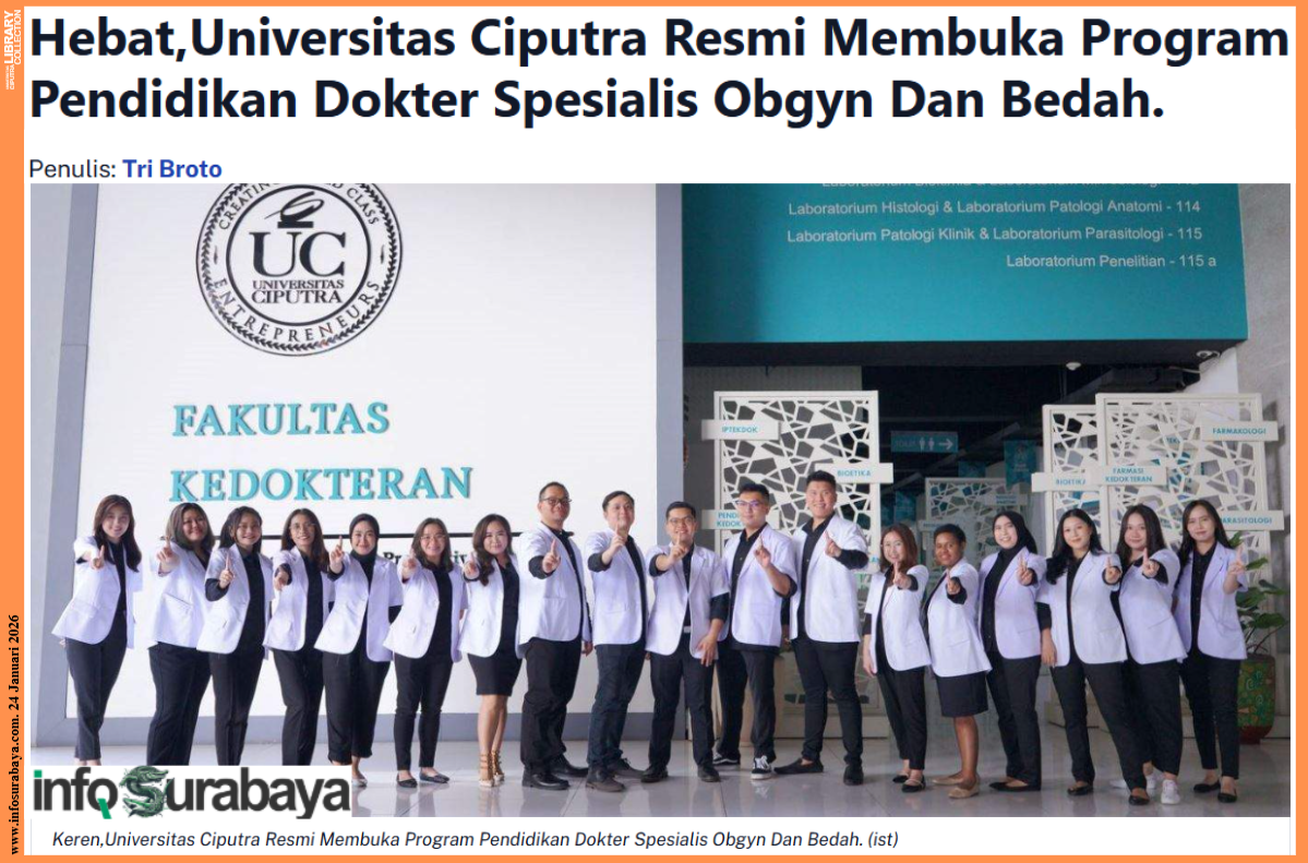 infoSurabaya |Surabaya- Sebuah langkah nyata Universitas Ciputra dalam menjawab kebutuhan dokter spesialis yang masih tinggi di Indonesia, khususnya di wilayah Indonesia Timur, membukaan Program Pendidikan Dokter Spesialis (PPDS) untuk dua bidang strategis, yakni Spesialis Obgyn dan Spesialis Bedah. Pembukaan ini setelah Fakultas Kedokteran Universitas Ciputra (FK UC) memperoleh izin resmi dari Kementerian Kesehatan Republik Indonesia (Kemenkes RI).