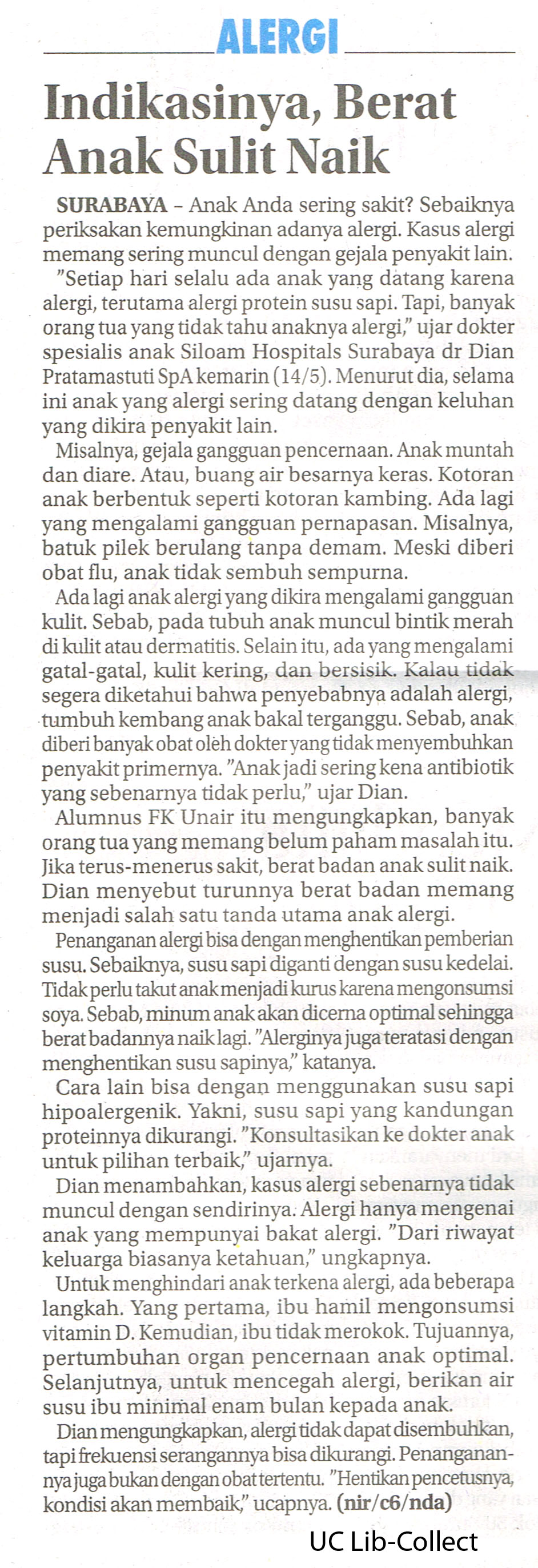 “Setiap hari selalu ada anak yang datang karena alergi, terutama alergi protein susu sapi. Tapi, banyak orang tua yang tidak tahu anaknya alergi,” ujar dokter spesialis anak Siloam Hospitals Surabaya dr Dian Pratamastuti SpA kemarin (14/5). Menurut dia, selama ini anak yang alergi sering datang dengan keluhan yang dikira penyakit lain.
