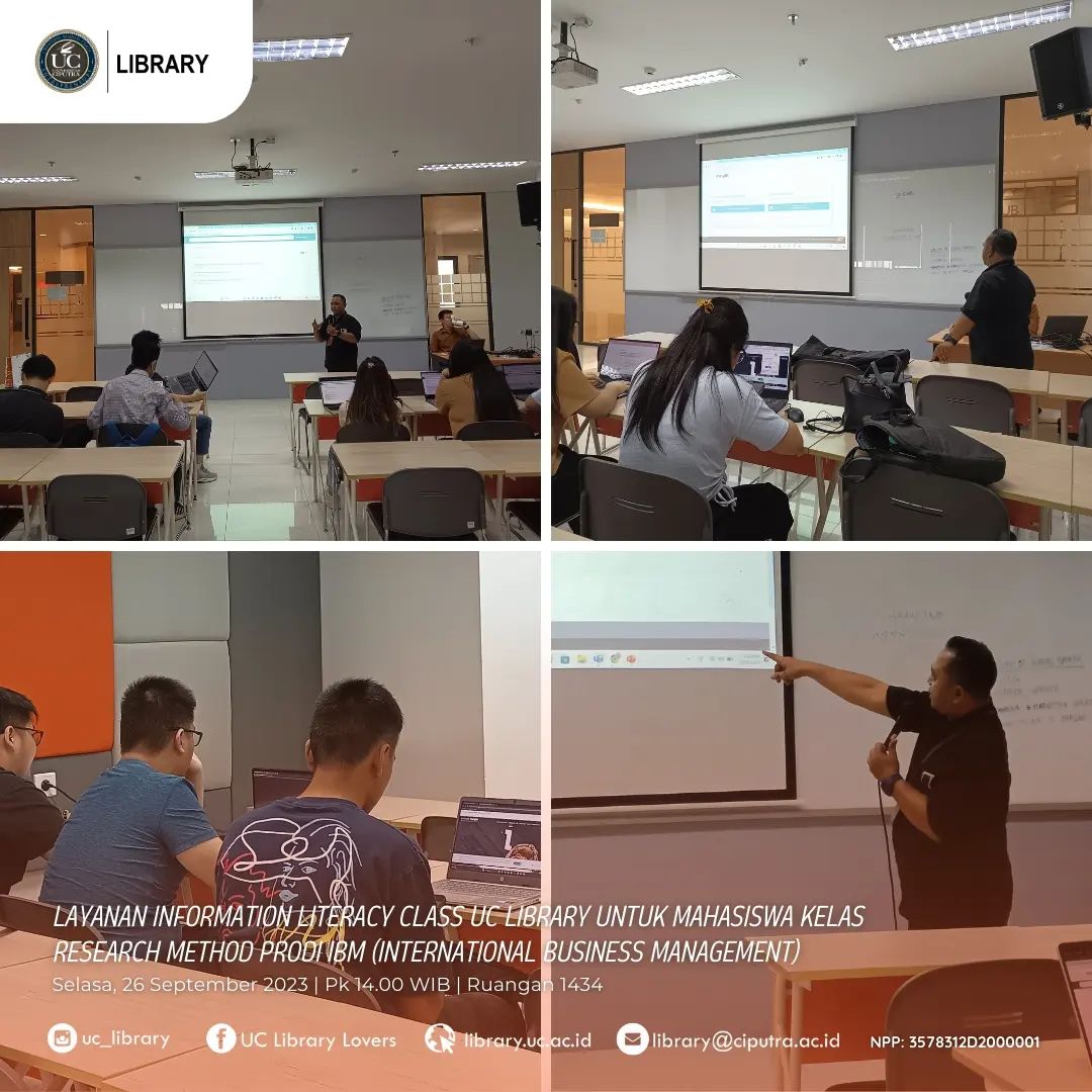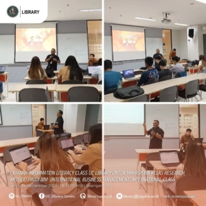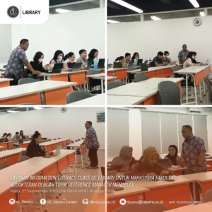 Pada bulan Oktober 2023 ini, UC Library hadir di kelas Research Method program studi International Business Management-Reguler Class (IBM-RC), International Business Management-International Class (IBM-IC), prodi Hotel & Tourism Business (HTB-UC), dan Fakultas Kedokteran dan memberikan pelatihan dengan topik Reference Manager Mendeley & Akses E-Resources yang sudah dilanggan oleh UC Library dan Pak R. Panji Yohanes Udik Esbiantoro, S.S.I. (Pustaakawan UC) hadir sebagai fasilitator. ✨