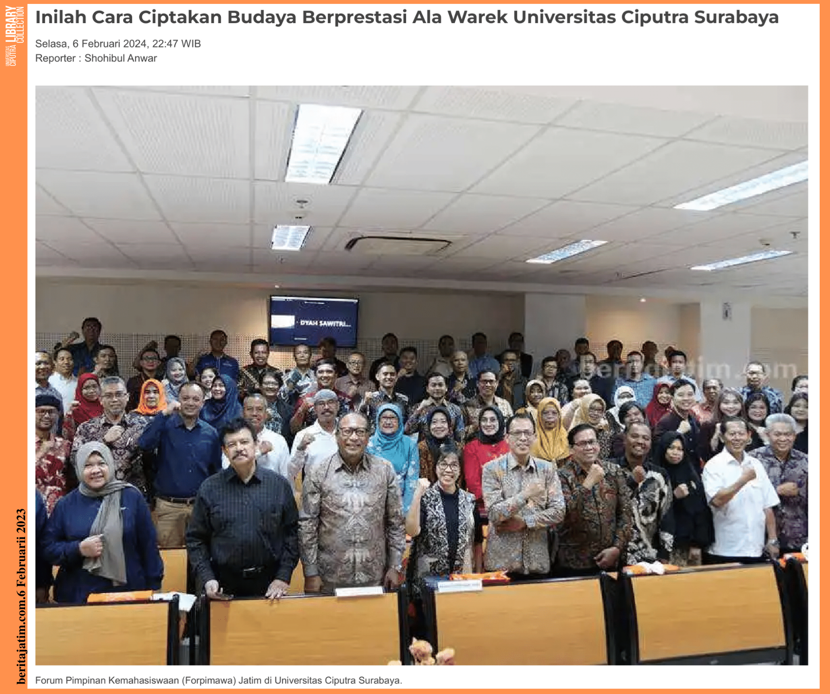 Surabaya (beritajatim.com) – Universitas Ciputra (UC) Surabaya menjadi tuan rumah Forum Pimpinan Kemahasiswaan (Forpimawa) Jatim. Setidaknya ada 80 wakil rektor (warek) bidang kemahasiswaan hadir dalam forum tersebut.