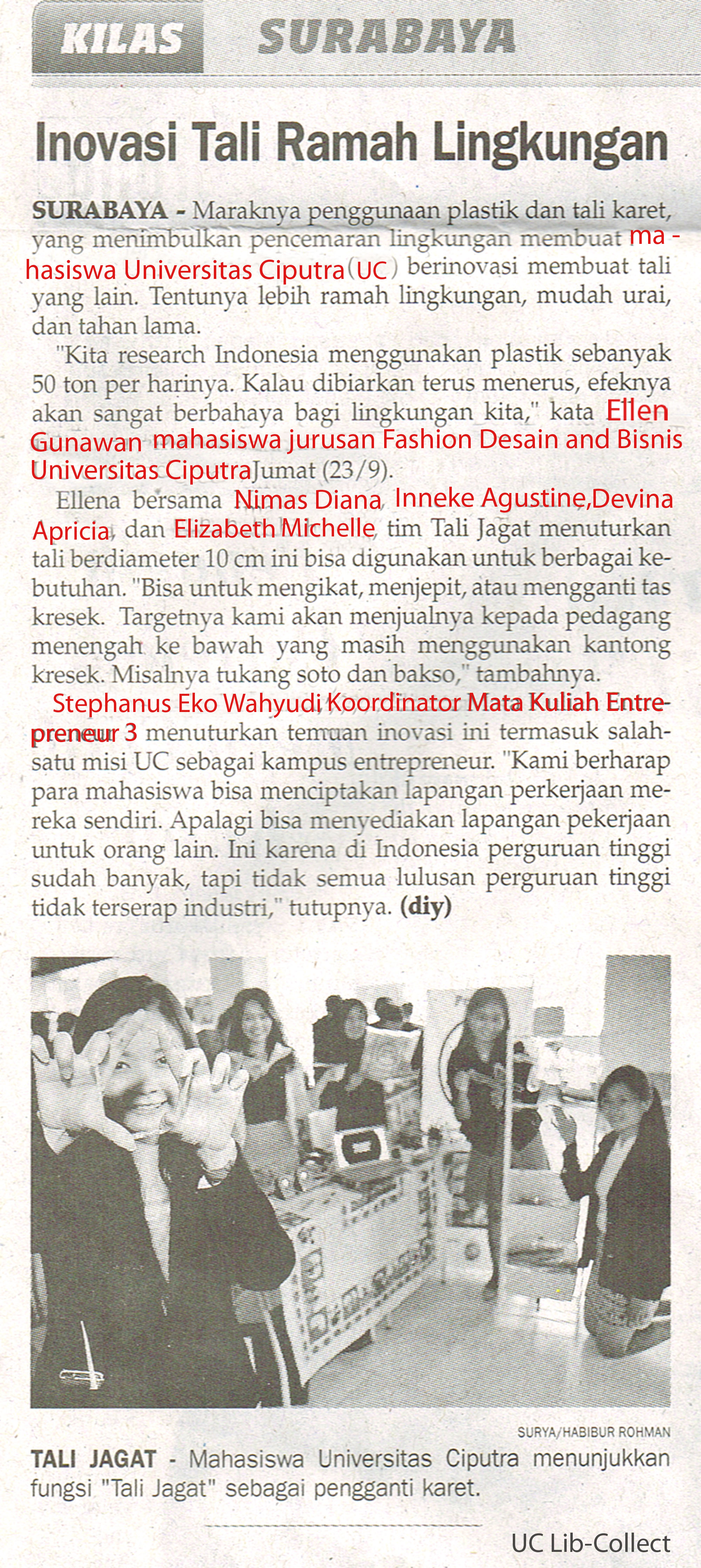 SURABAYA- Maraknya penggunaan plastic dan karet, yang menimbulkan pencemaran lingkungan membuat mahasiswa Universitas Ciputra (UC) berinovasi membuat tali yang lain. Tentunya lebih ramah lingkungan, mudah urai dan tahan lama.