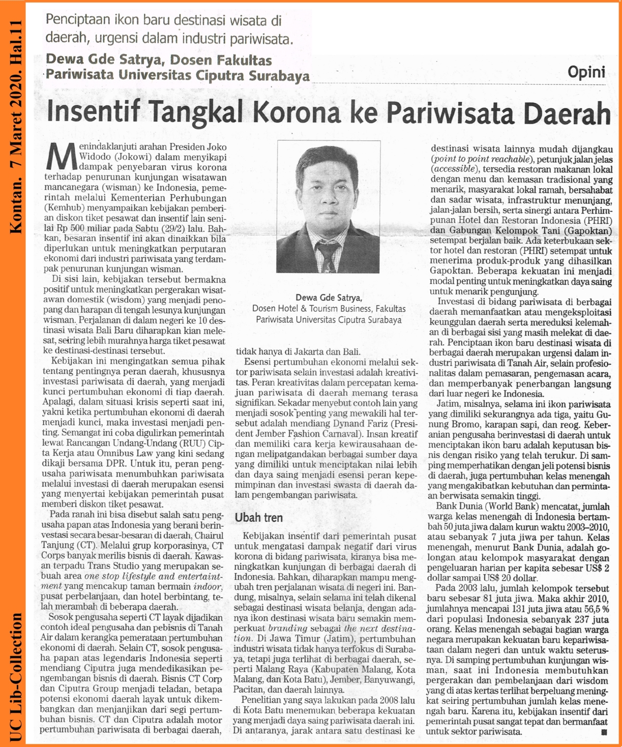 Kebijakan insentif dari pemerintah pusat untuk mengatasi dampak negatif dari virus korona di bidang pariwisata, kiranya bisa meningkatkan kunjungan di berbagai daerah di Indonesia. Bahkan, diharapkan mampu mengubah tren perjalanan wisata di negeri ini. Bandung, misalnya, selain selama ini telah dikenal sebagai destinasi wisata belanja, dengan adanya ikon destinasi wisata baru semakin memperkuat branding sebagai the next destination. Di Jawa Timur (Jatim), pertumbuhan industri wisata tidak hanya terfokus di Surabaya, tetapi juga terlihat di berbagai daerah, seperti Malang Raya (Kabupaten Malang, Kota Malang, dan Kota Batu), Jember, Banyuwangi, Pacitan, dan daerah lainnya.