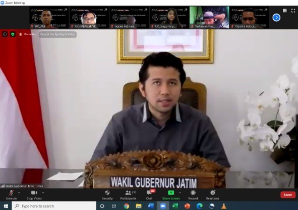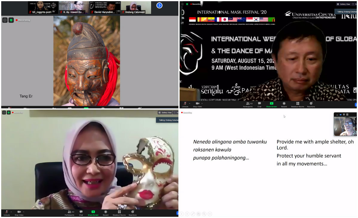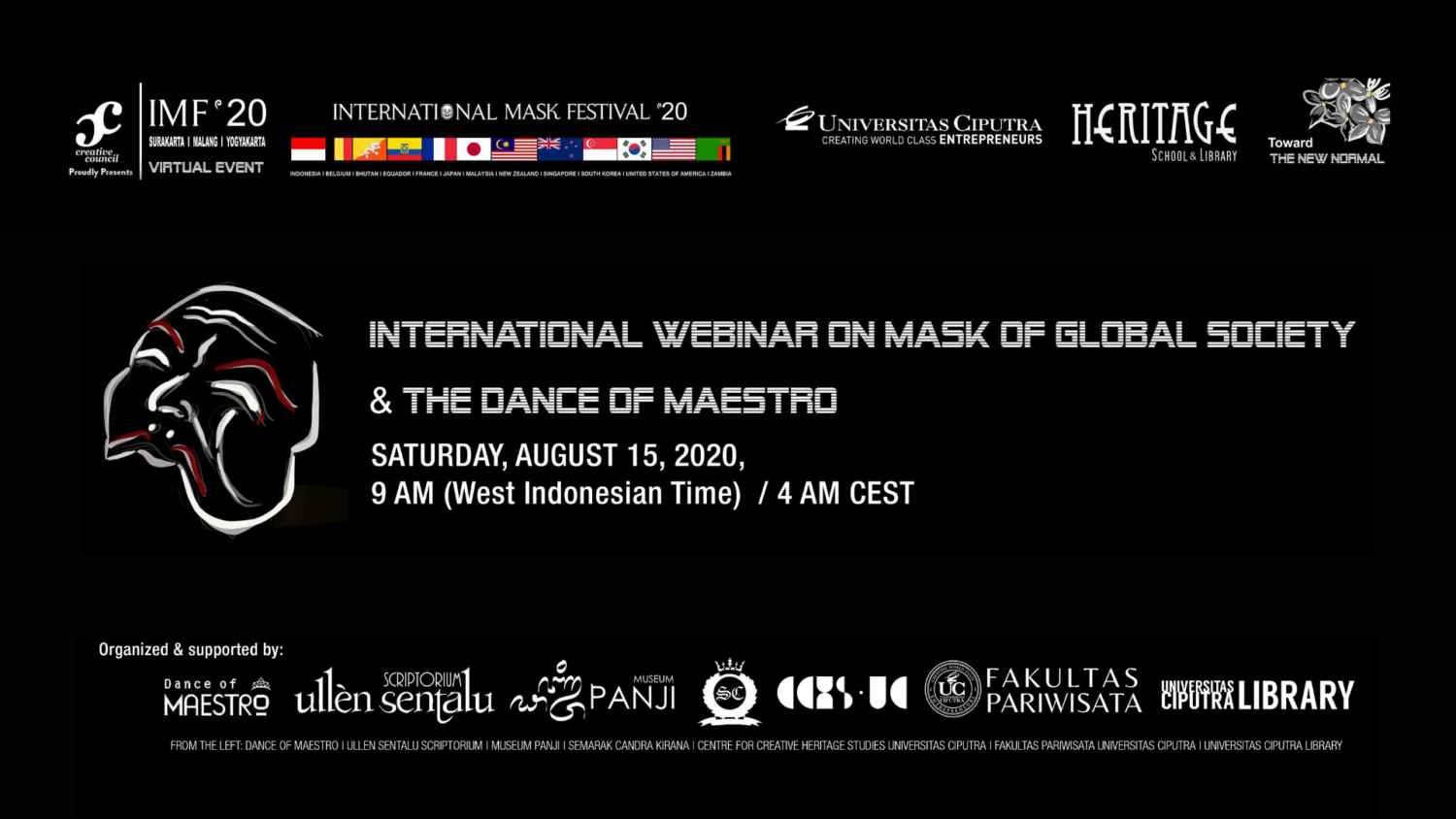 International Webinar on Mask of Global Society and The Dance of Maestro yang diselenggarakan pada Sabtu lalu (15/8) dihadiri oleh 210 peserta dari kalangan mahasiswa, akademisi dan praktisi. Kegiatan yang dimulai Pkl. 09.00 WIB dan diadakan secara virtual ini dibuka oleh Wakil Gubernur Jawa Timur, Dr. H. Emil Elestianto Dardak, M.Sc., dan beliau memberikan apresiasi kepada Universitas Ciputra, para pembicara, para maestro tari, dan juga partisipasi peserta atas terselenggaranya event ini di tengah masa pandemi dan tetap memiliki semangat untuk mempelajari serta memperkenalkan budaya Indonesia dan juga dunia melalui topeng dan tari. Sambutan pembuka selanjutnya disampaikan oleh Dr. Hilmar Farid, Direktur Jenderal Kebudayaan Kementerian Pendidikan dan Kebuayaan, dengan memberikan catatan bahwa acara ini diharapkan dapat menghasilkan rekomendasi bagi pemerintah untuk kelestarian budaya Indonesia. Kemudian dilanjutkan dengan sambutan dari Mr. Jeong Hongsik, sekretaris umum International Mask Arts & Cultural Organization, Daniel Haryodiningrat B.A., M.Hum., Direktur Museum Ullen Sentalu, dan Ir. Yohannes Somawiharja, M.Sc., Rektor Universitas Ciputra Surabaya sebagai tuan rumah kegiatan International Webinar on Mask of Global Society and The Dance of Maestro.