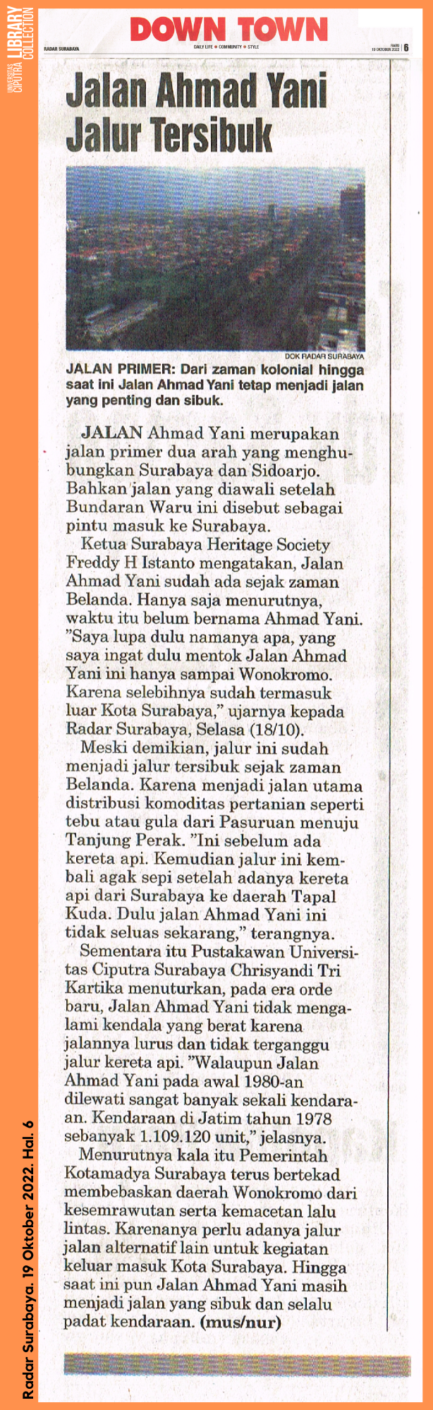 Ketua Surabaya Heritage Society Freddy H Istanto mengatakan, Jalan Ahmad Yani sudah ada sejak zaman Belanda. Hanya saja menurutnya, waktu itu belum bernama Ahmad Yani. “Saya lupa dulu namanya apa, yang saya ingat dulu mentok jalan Ahmad Yani ini hanya sampai Wonokromo. Karena selebihnya sudah termasuk luar kota Surabaya,” ujarnya kepada Radar Surabaya, Selasa (18/10)