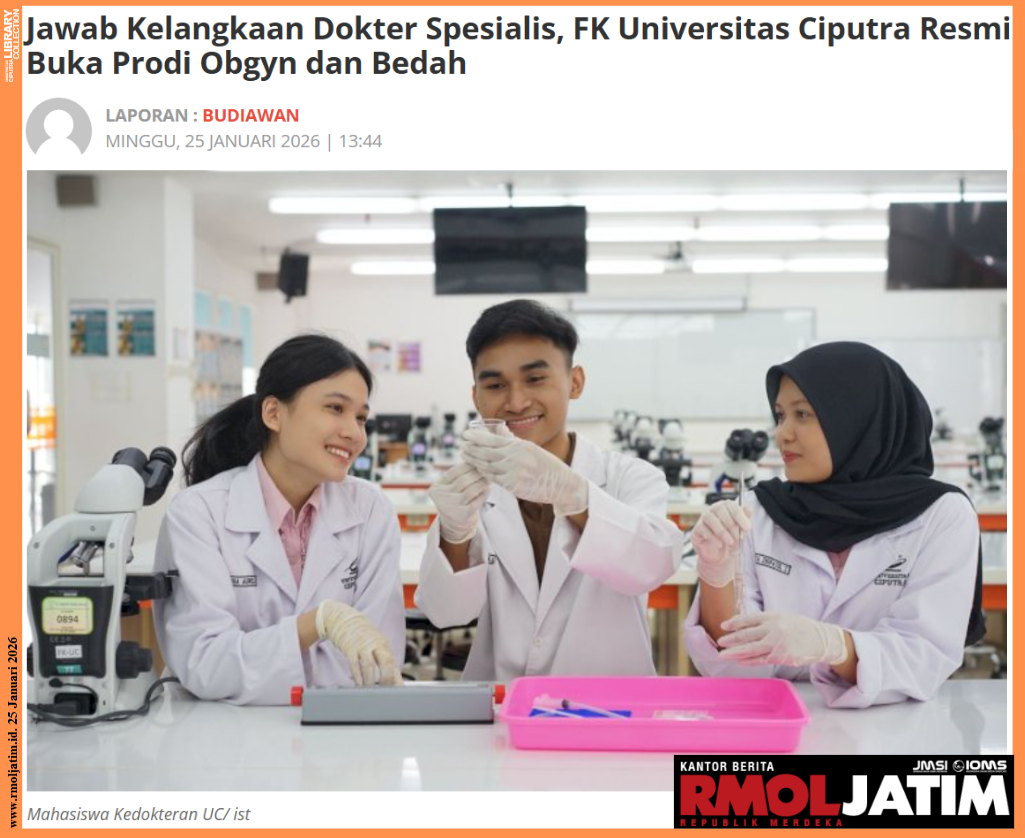 Fakultas Kedokteran Universitas Ciputra (FK UC) Surabaya resmi melebarkan sayapnya di dunia pendidikan medis. Kampus ini baru saja mengantongi izin untuk membuka dua Program Pendidikan Dokter Spesialis (PPDS) sekaligus, yakni Spesialis Obstetri dan Ginekologi (Obgyn) serta Spesialis Bedah.