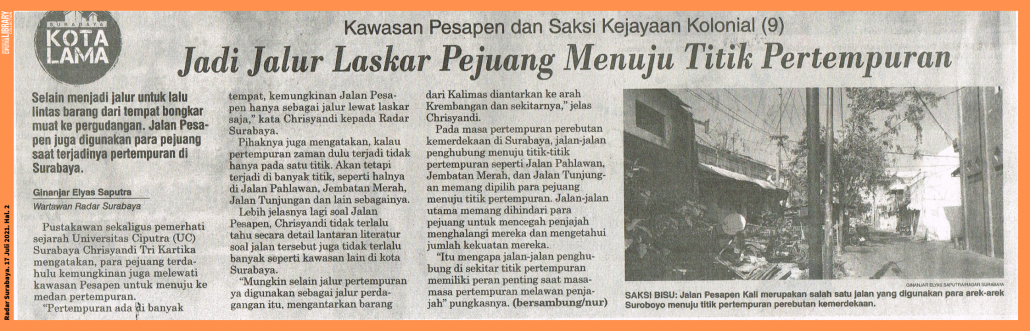 Pustakawan sekaligus pemerhati sejarah Universitas Ciputra (UC) Surabaya Chrisyandi Tri Kartika mengatakan, para pejuang terdahulu kemungkinan juga melewati kawasan Pesapen untuk menuju ke medan pertempuran. “Pertempuran ada di banyak tempat, kemungkinan Jalan Pesapen hanya sebagai jalur lewat laskar saja,” kata Chrisyandi kepada Radar Surabaya.