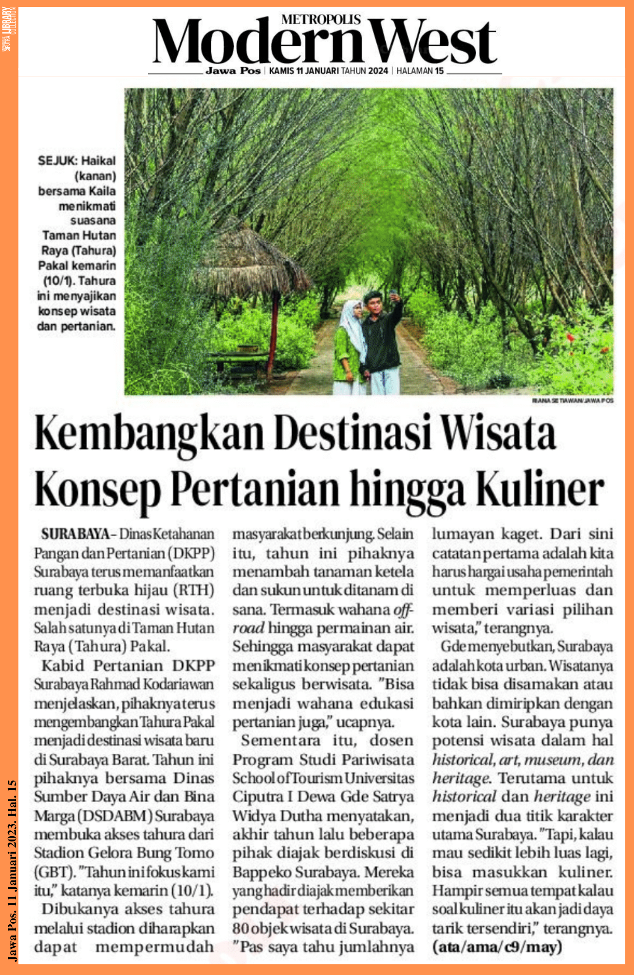 Kabid Pertanian DKPP Surabaya Rahmad Kodariawan menjelaskan, pihaknya terus mengembangkan Tahura Pakal menjadi destinasi wisata baru di Surabaya Barat. Tahun ini pihaknya bersama Dinas Sumber Daya Air dan Bina Marga (DSDABM) Surabaya membuka akses tahura dari Stadion Gelora Bung Tomo(GBT). “Tahun ini fokus kami itu,” katanya kemarin (10/1).