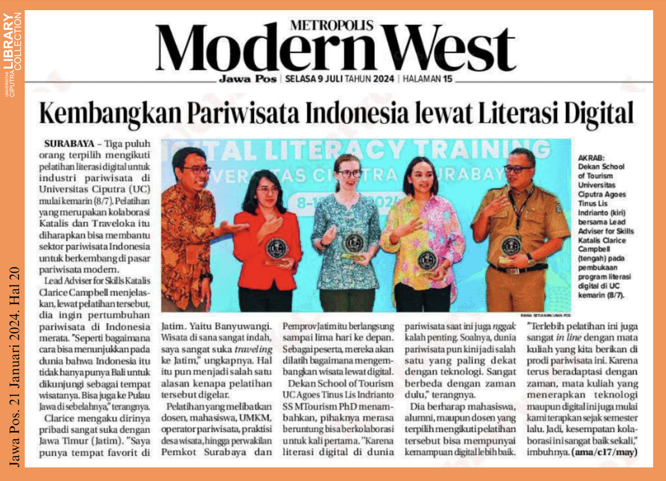 SURABAYA – Tiga pulih orang terpilih mengikuti pelatihan literasi digital untuk industri pariwisata di Universitas Ciputra (UC) mulai kemarin (8/7). Pelatihan yang merupakan kolaborasi Katalis dan Traveloka itu mengharapkan bisa membantu sektor pariwisata Indonesai untuk berkembang di pasar pariwisata modern.