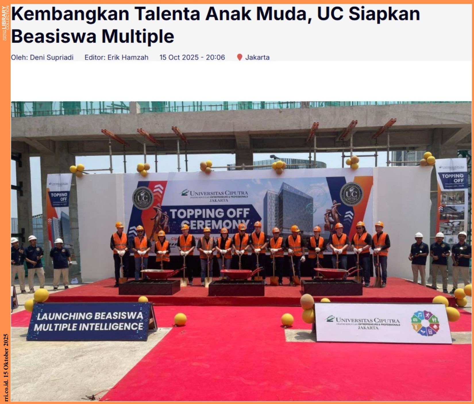 “Setiap universitas memiliki momen yang mencerminkan jiwanya. UC Jakarta, momen itu bukan semata pada beton dan baja yang berdiri, tetapi pada pemikiran dan mimpi yang akan menghidupi kampus ini,” ujar Prof. Dr. Ir. Denny Bernardus, M.M, Director Board of Executive Yayasan Ciputra Pendidikan, dalam keterangan resminya di Jakarta, Rabu (15/10/2025).