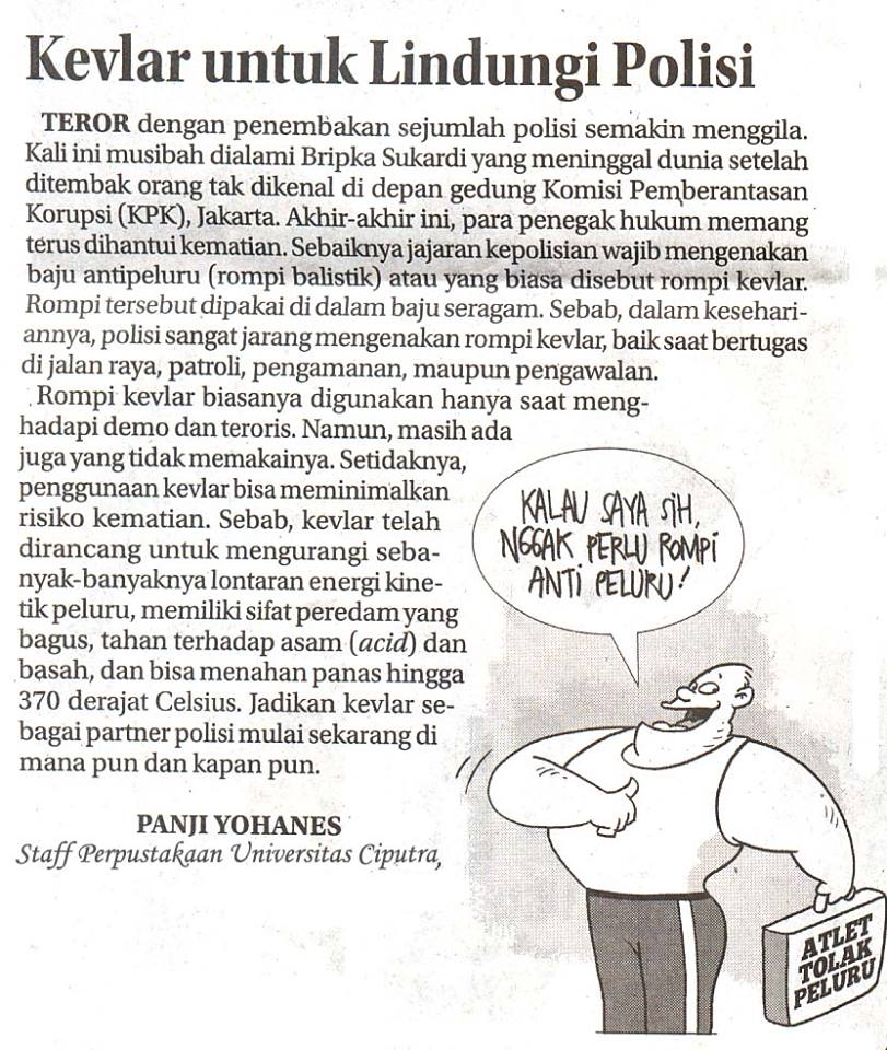 TEROR dengan penembakan sejumlah polisi semakin menggila. Kali ini mesibah dialami oleh Bripka Sukardi yang meninggal dunia setelah ditembak orang yang tak dikenal, didepan gedung Komisi Pemberantasan Korupsi (KPK), Jakarta, akhir-akhir ini para penegak hukum memang terus dihasntui kematian. Sebaiknya jajaran kepolisian wajib mengenakan baju anti peluru (rompi balistik) atau yang biasa disebut rompi kevlar. Rompi tersebut dipakai dalam baju seragam sebab dalam kesehariannya, polisi sangat jarang mengenakan rompi kevlar, baik saat bertugas dijalan raja, patroli, pengamanan, maupun pengawalan.