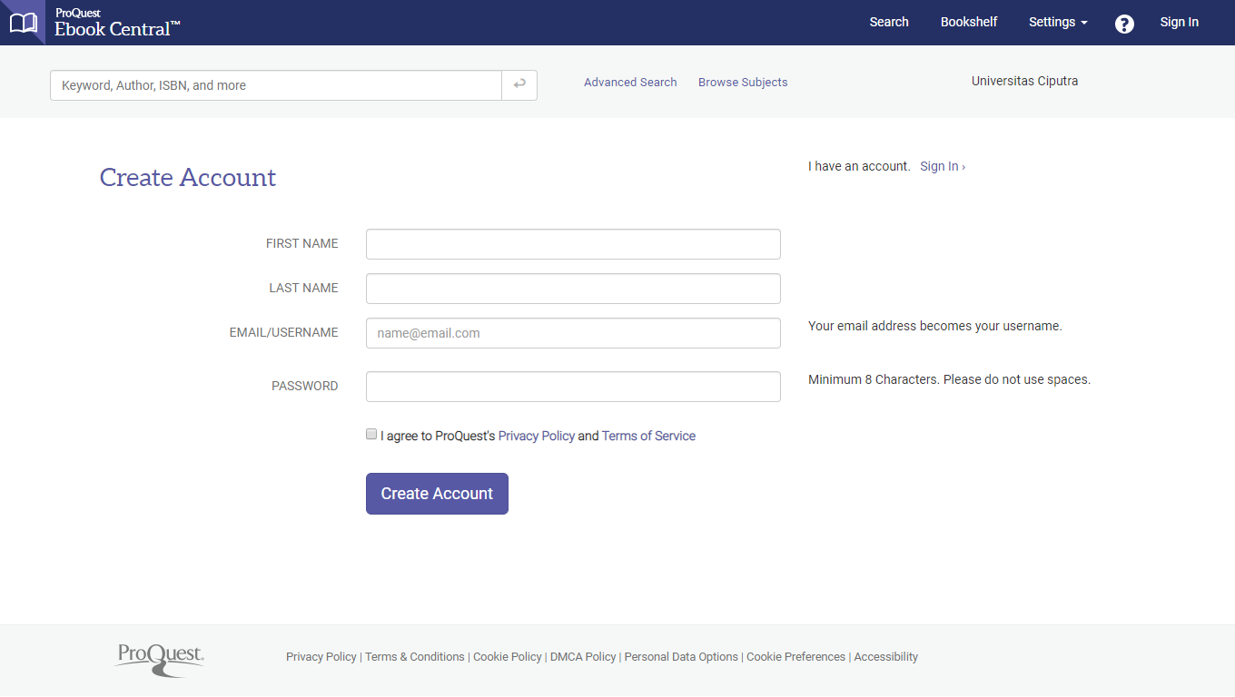4. Untuk membuat akun ProQuest, pilih menu create account pada halaman sign in dan isi kolom nama, email dan password. Setelah semua diisi dengan benar, pilih/centang pada kotak I agree to ProQuest’s Privacy Policy and Terms of Service dan pilih menu Create Account.