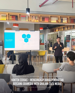 Hari kedua Gramedia Goes to Campus pada 28 Oktober 2025 di UC penuh energi — Dunia penerbitan kini bukan lagi sekadar soal mencetak buku — melainkan tentang bagaimana ide, kreativitas, dan strategi bisa bersinergi menjadi konten yang berdampak. Hal inilah yang diangkat dalam sesi Konten Cerdas bersama Ghulam dari Elex Media Komputindo, salah satu label penerbit terkemuka di bawah naungan Gramedia. Melalui pemaparannya yang inspiratif di perpustakaan UC laintai 2A, UC Main Building, Ghulam membuka wawasan peserta mengenai proses panjang di balik sebuah buku: mulai dari riset naskah, penyuntingan, desain, hingga strategi pemasaran yang adaptif terhadap tren digital. Ia juga menyoroti pentingnya content literacy bagi generasi muda yang ingin terjun ke dunia kreatif dan penerbitan.