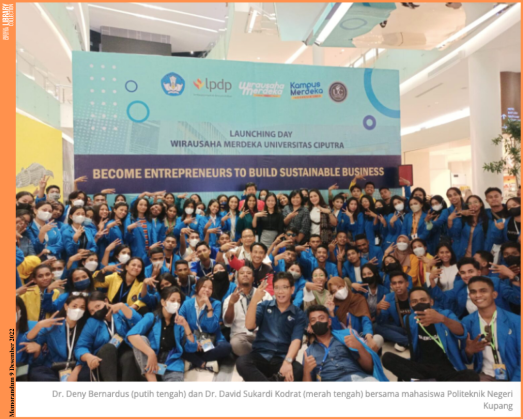 Surabaya, memorandum.co.id – Kejutan terjadi pada hari kedua pelaksanaan Launching Day Wirausaha Merdeka (WMK) Universitas Ciputra, Jumat (9/12/2022). Sebanyak 330 peserta WMK Politeknik Negeri Kupang berkunjung ke lokasi Launching Day WMK UC di Ciputra World Surabaya didampingi 70 fasilitator. Kunjungan tersebut merupakan bagian dari rangkaian kegiatan yang dilakukan WMK Politeknik Negeri Kupang di beberapa lokasi di kota Surabaya dan Malang, meliputi beberapa perusahaan, perguruan tinggi, dan sentra UMKM.