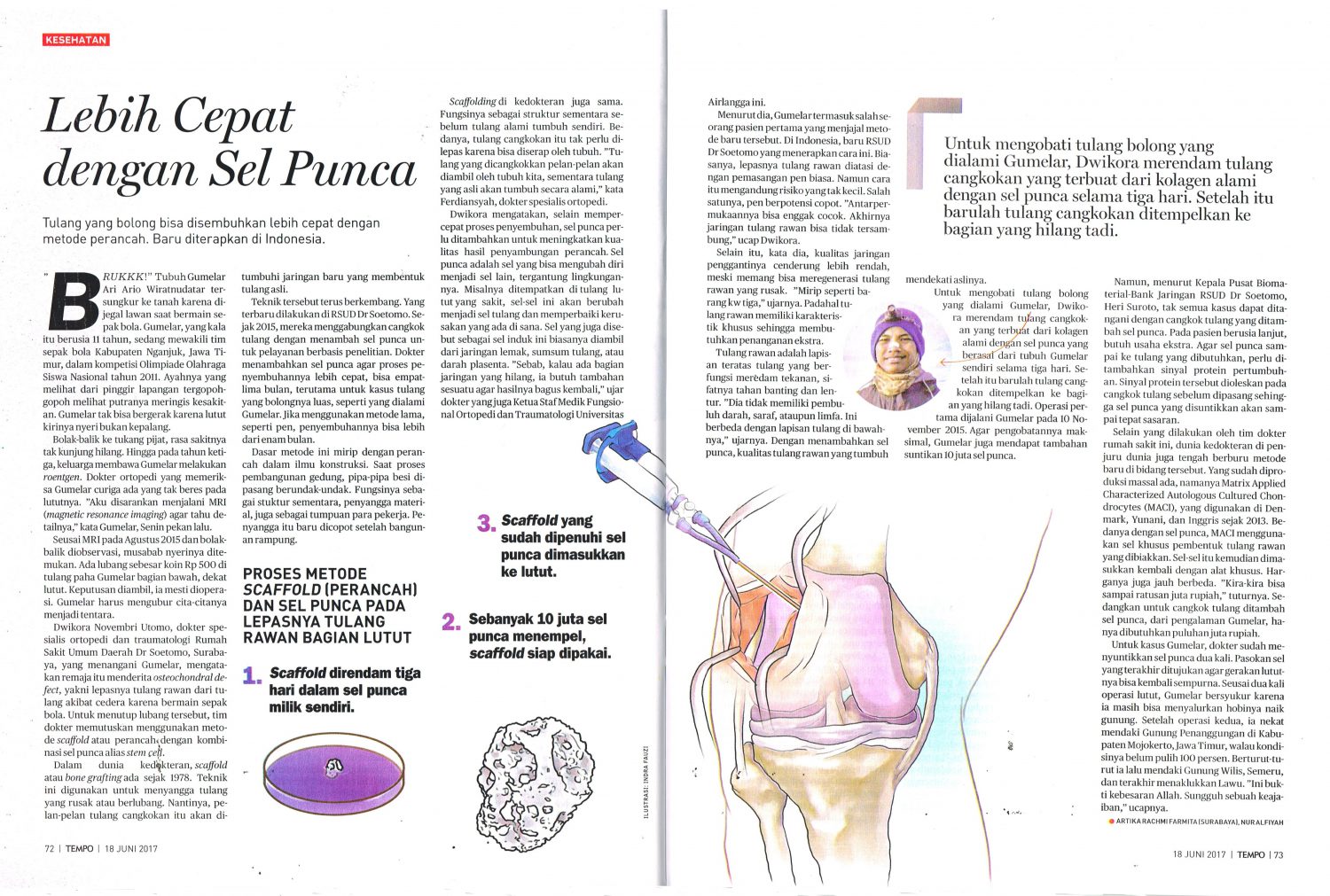 “Untuk mengobati tulang bolong yang dialami Gumelar, Dwikora merendam tulang cangkokan yang terbuat dari kolagen alami dengan sel punca selama tiga hari. Setelah itu barulah cangkokan ditempelkan ke bagian yang hilang tadi.”