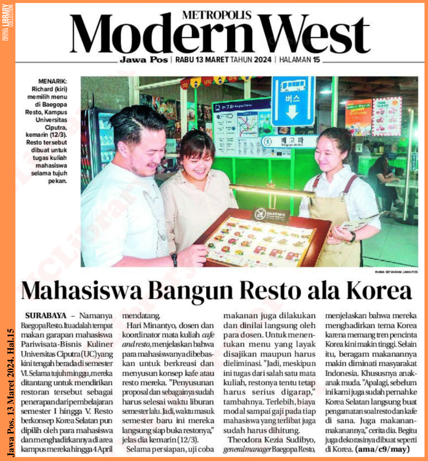 SURABAYA – Namanya Baegopa Resto Itu adalah tempat makan garapan mahasiswa Pariwisata-Bisnis Kuliner Universitas Ciputra (UC) yang kini tengah berada di semester VI. Selama tujuh minggu,mereka ditantang untuk mendirikan restoran tersebut sebagai penerapan dari pembelajaran