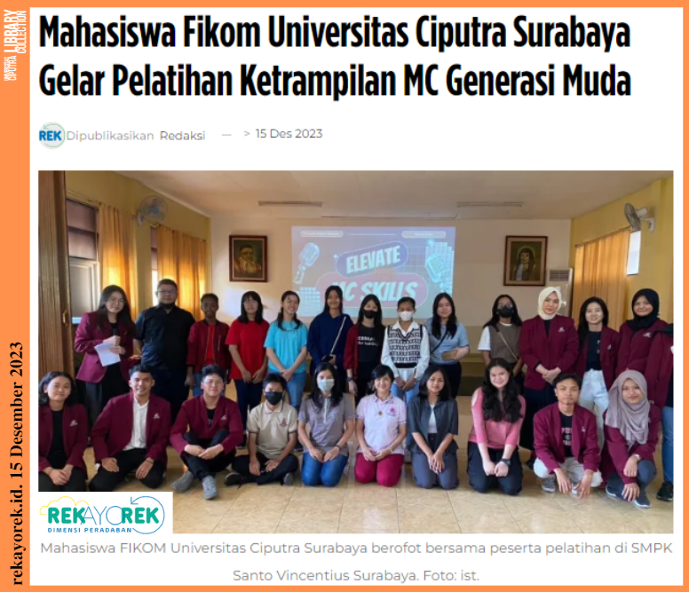 Mahasiswa Fikom Universitas Ciputra Surabaya menggelar pelatihan keterampilan MC generasi muda. Acara ini telah terlaksana selama dua hari berturut turut sejak tanggal 2-3 Desember 2023, yang berlokasi di SMPK Santo Vincentius Surabaya.