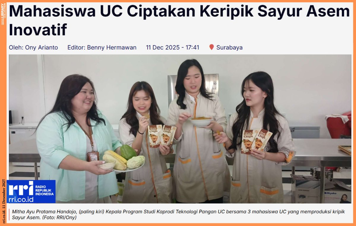 KBRN, Surabaya: Tiga mahasiswa dari program studi Teknologi Pangan Universitas Ciputra Surabaya, mengolah makanan sayur asem menjadi kripik. Inovasi dibidang Pangan tersebut kata Mitha Ayu Pratama Handojo, Kepala Program Studi Kaprodi Teknologi Pangan UC, pernah menyabet gelar juara keempat di SIAL Inovation Food yang berlangsung di Jakarta, Kamis (11/12/2025).