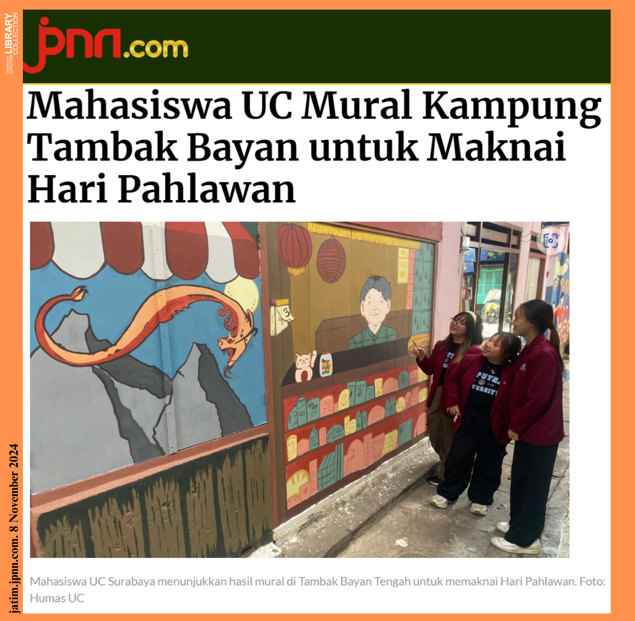 Sumber:https://jatim.jpnn.com/jatim-terkini/33313/mahasiswa-uc-mural-kampung-tambak-bayan-untuk-maknai-hari-pahlawan