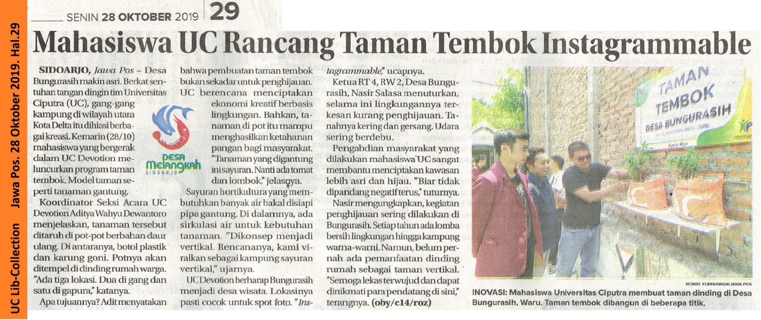 Mahasiswa UC Rancang Taman Tembok Instagrammable. Jawa Pos. 28 Oktober 2019. Hal.29