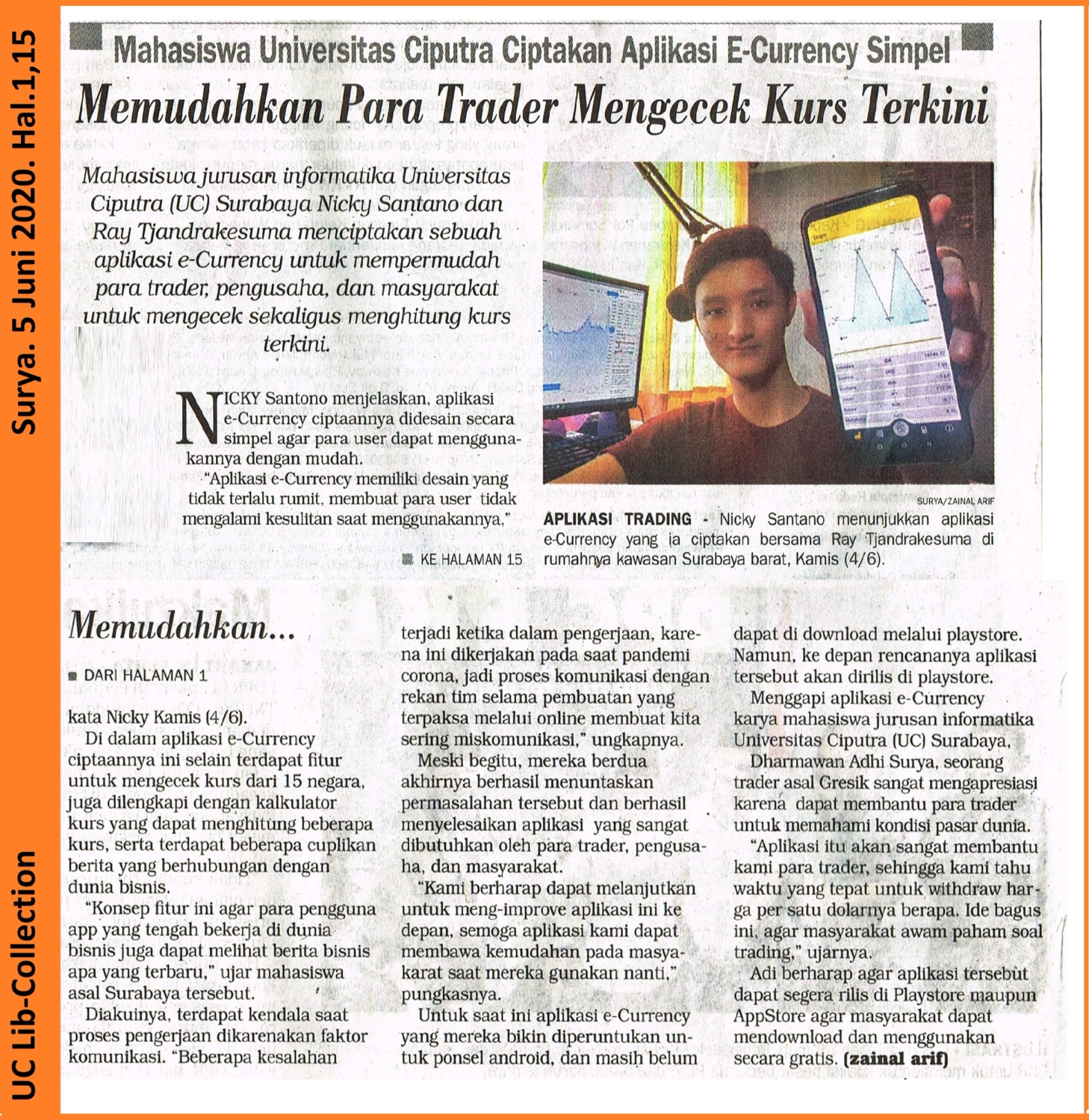 Mahasiswa jurusan informatika Universitas Ciputra (UC) Surabaya Nicky Santano dan Ray Tjandrakesuma menciptakan sebuah aplikasi e-Currency untuk mempermudah para trader, pengusaha, dan masyarakat untuk mengecek sekaligus menghitung kurs terkini
