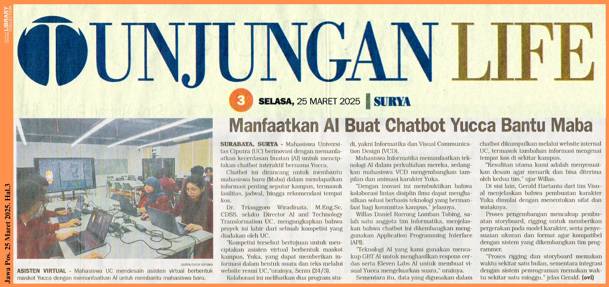 SURABAYA, SURYA – Mahasiswa Universitas Ciputra (UC) berinovasi dengan memanfaatkan kecerdasan buatan (AI) untuk menciptakan chatbot interaktif bernama Yucca.