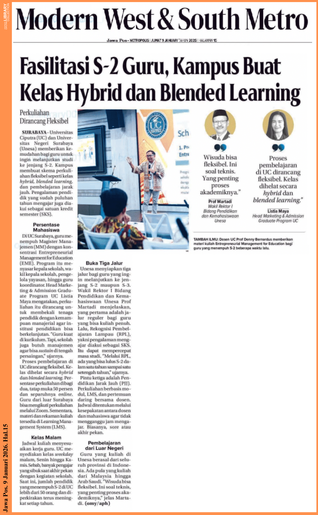Ciputra University (UC) and Surabaya State University (UNESA) are making it easier for teachers to pursue master’s degrees. The universities have created flexible learning schemes, including hybrid classes, blended learning, and distance learning. Decades of teaching experience are also recognized as semester credit units (SKS) for teachers.