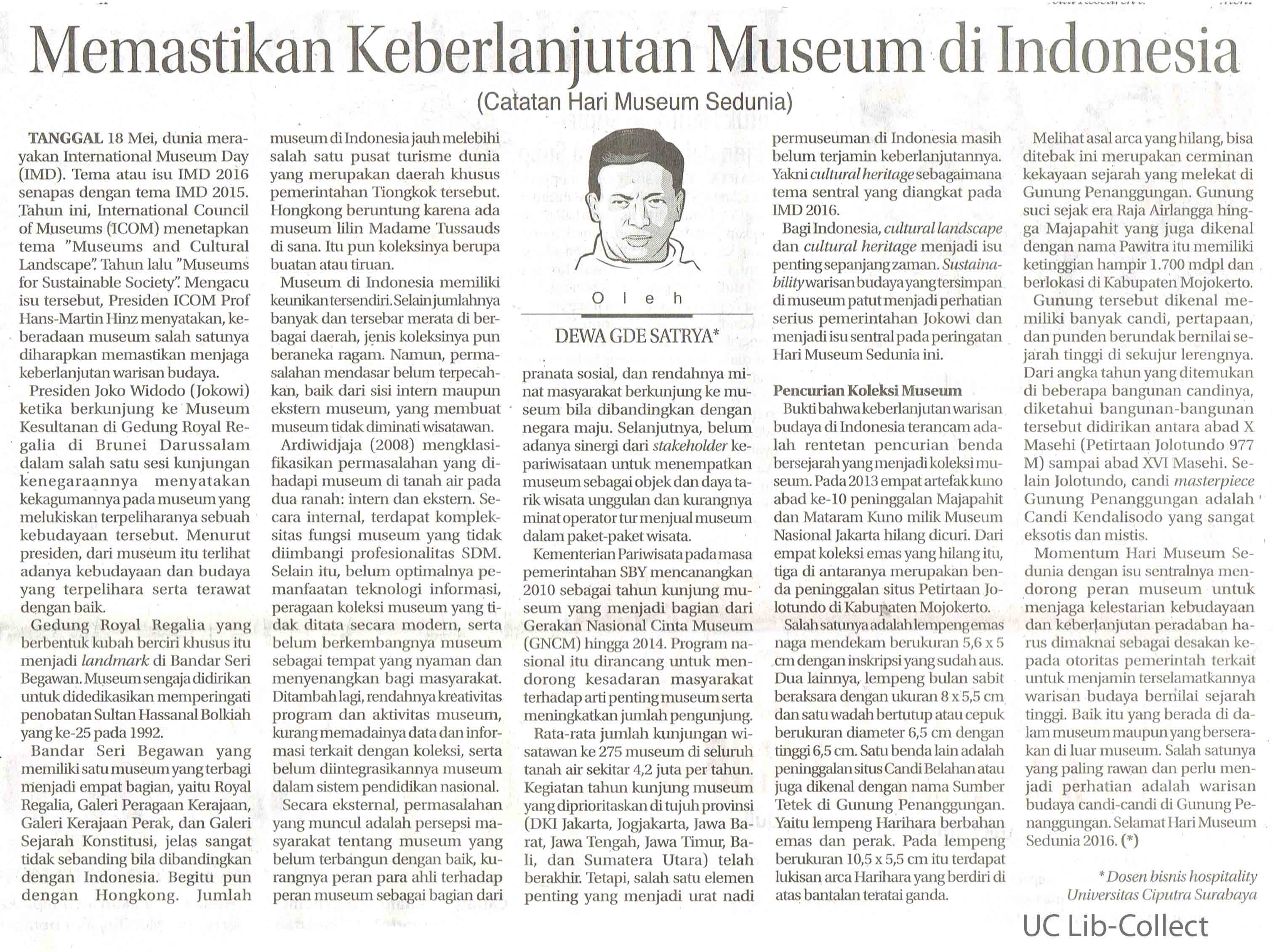 Tanggal 18 Mei, dunia merayakan International Muesum day (IMD). Tema atau isu IMD 2016 senapas dengan tema IMD 2015. Tahun ini, International Council of Museums (ICOM) menetapkan tema “Museums and Cultural Landscape”. Tahun lalu “Museums for Sustainabel Society”. Mengacu isu tersebut, presiden ICOM Prof Hans-Martin Hinz menyatakan, keberadaan museum salah satunya diharapkan memastikan menjaga keberlanjutan warisan budaya. Presiden Joko Widodo (Jokowi) ketika berkunjung ke museum kesultanan di Gedung Royal Regalia di Brunei Darussalam dalam salah satu sesi kunjungan kenegaraannya menyatakan kekagumannya pada museum yang melukiskan terpeliharanya sebuah kebudayaan tersebut. Menurut presiden, dari museum itu terlihat adanya kebudayaan dan budaya yang terpelihara serta terawatt dengan baik.