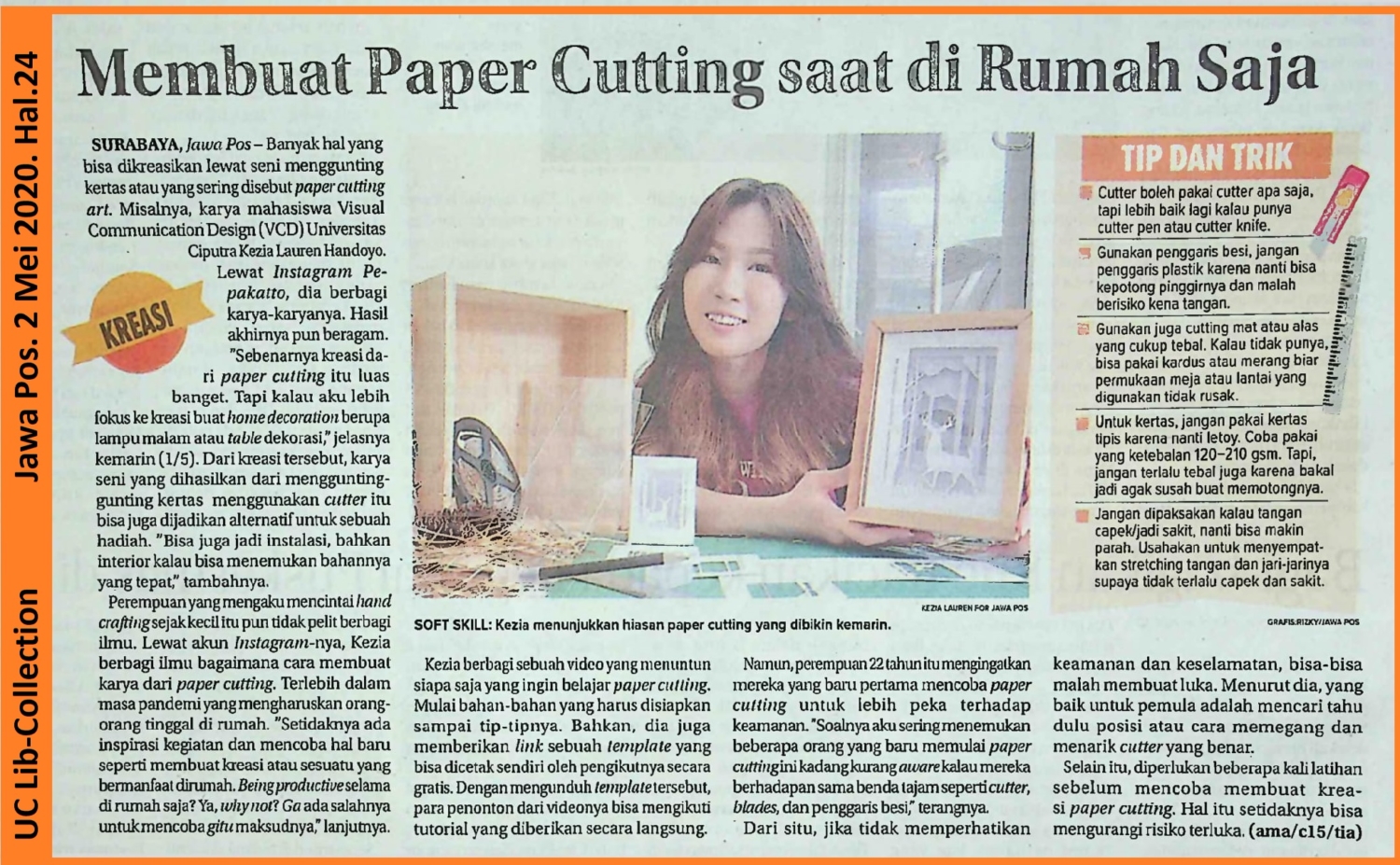 SURABAYA, Jawa Pos — Banyak hal yang bisa dikreasikan lewat seni menggunting kertas atau yang sering disebut paper cutting art. Misalnya, karya mahasiswa Visual Communication Design (VCD) Universitas Ciputra Kezia Lattren Handoyo. Lewat Instagra Pepakatto, dia berbagi karya-karyanya. Hasil akhirnya pun beragam. “Sebenarnya kreasi dari paper cutting itu luas banget. Tapi kalau aku lebih fokus ke kreasi buat home decoration berupa lampu malam atau table dekorasi,” jelasnya kemarin (1/5). Dari kreasi tersebut, karya seni yang dihastlkan dari menggunting-gunting kertas menggunakan cutter itu bisa juga dijadikan alternatif untuk sebuah hadiah. “Bisa juga jadi instalasi, bahkan interior kalau bisa menemukan bahannya yang tepat,” tambahnya.