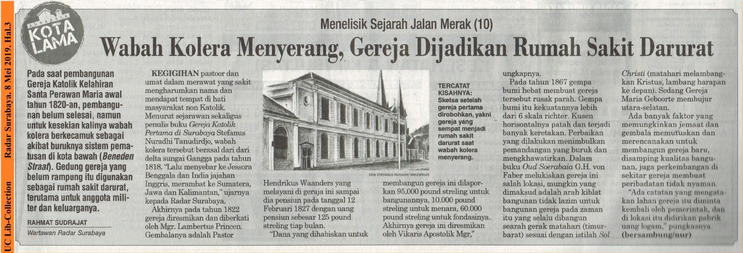KEGIGIHAN pastor dan umat dalam merawat yang sakit mengharumkan nama dan mendapat tempat di hati masyarakat non Katolik. Menurut sejarawan sekaligus penulis buku Gereja Katolik Pertama di Surabaya Stefanus Nuradhi Tanuridjo, wabah kolera tersebut berasal dari delta sungai Gangga pada tahun 1818. “Lalu menyebar ke Jessora Benggala dan India jajahan Inggris, merambat ke Sumatera, Jawa dan Kalimantan,” ujarnya kepada Radar Surabaya.