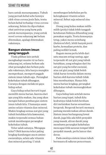 Tiada pilihan lain untuk menghadapi musim virus baru sekarang ini, selama belum ada obat penangkal dan belum pula ada vaksinnya, kita hanya mungkin memperkuat, mempertangguh sistem imun tubuh saja. Perangkat kekebalan tubuh dibangun. Caranya dengan melakoni gaya hidup sehat.